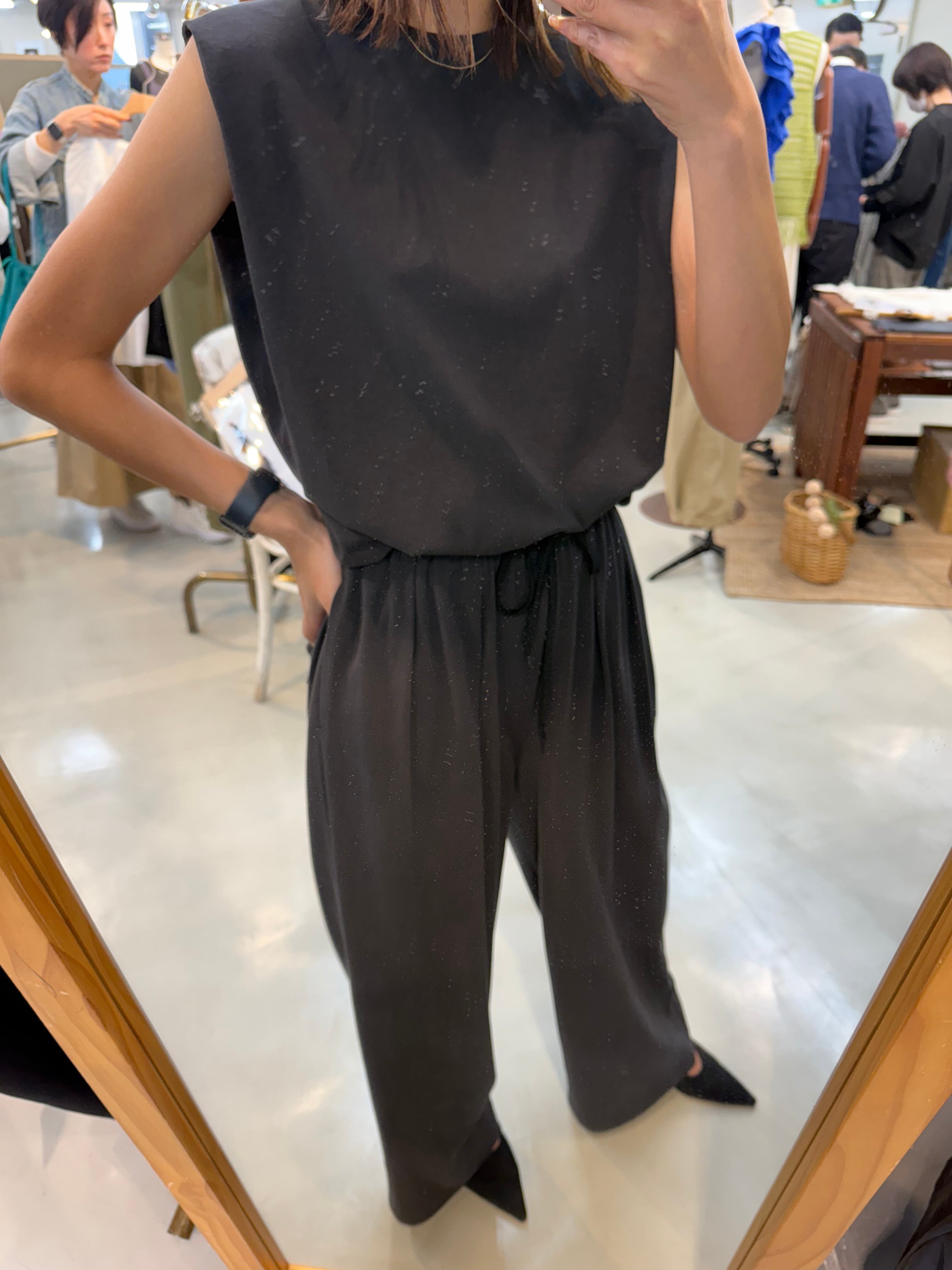 ワイドイージーパンツ。適度なハリとオチ感があり肌離れの良い素材のため体のラインを拾わずシルエットをキレイに見せてくれます。