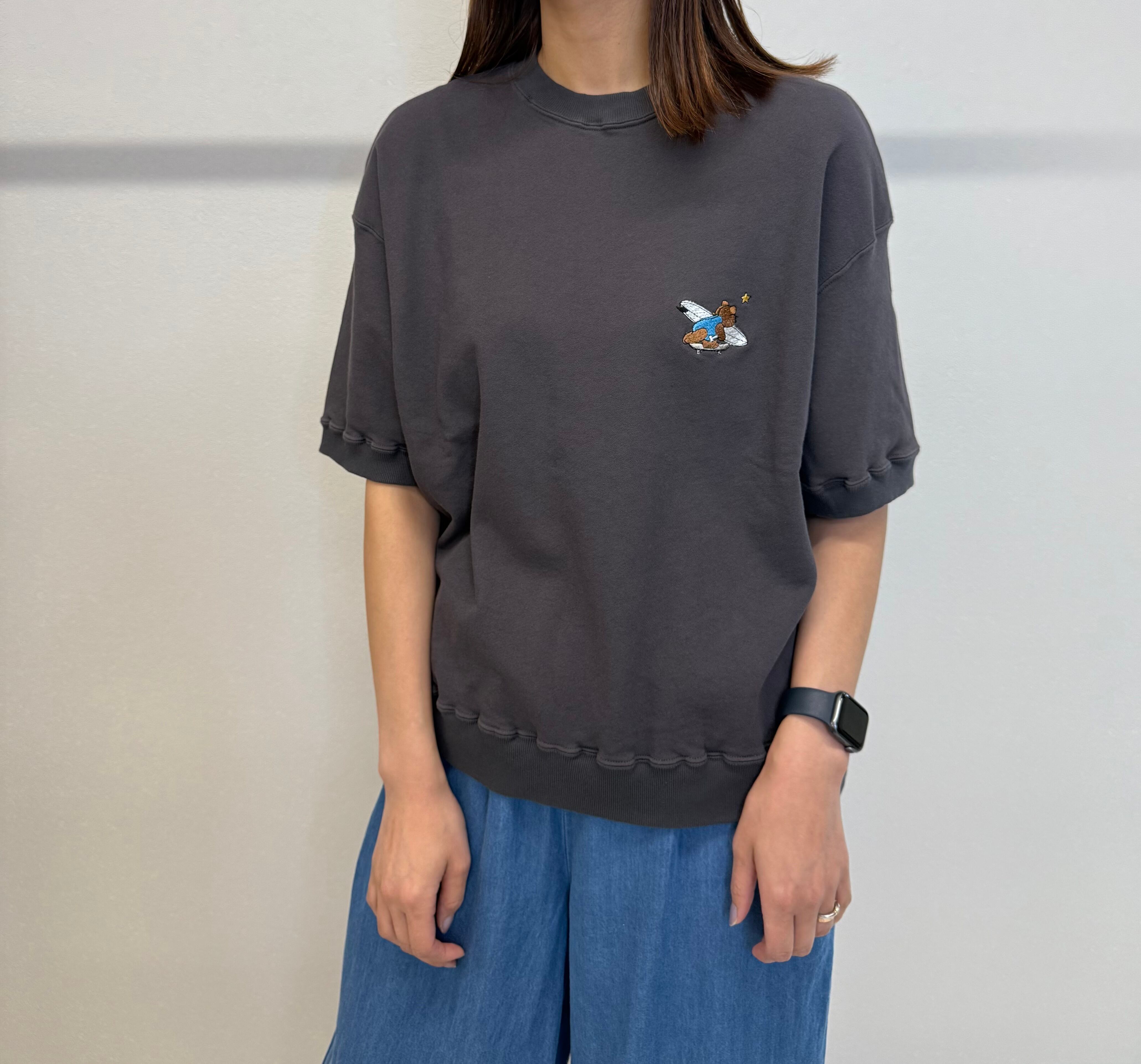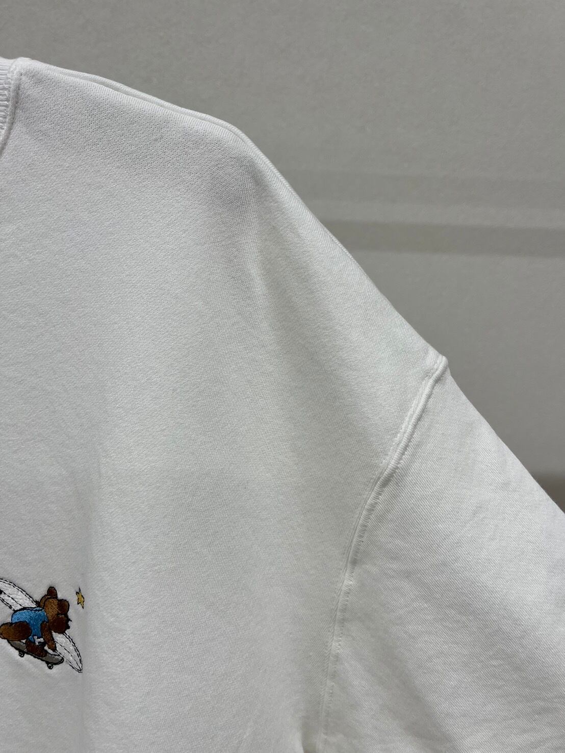 ナチュラルでありながらシャリ感のある、汎用性の高い裏毛を使用しているのもポイント。胸元のスケボーサーフィンとベアの刺繍が愛らしく、コーディネートに抜け感を与えてくれる一枚です。