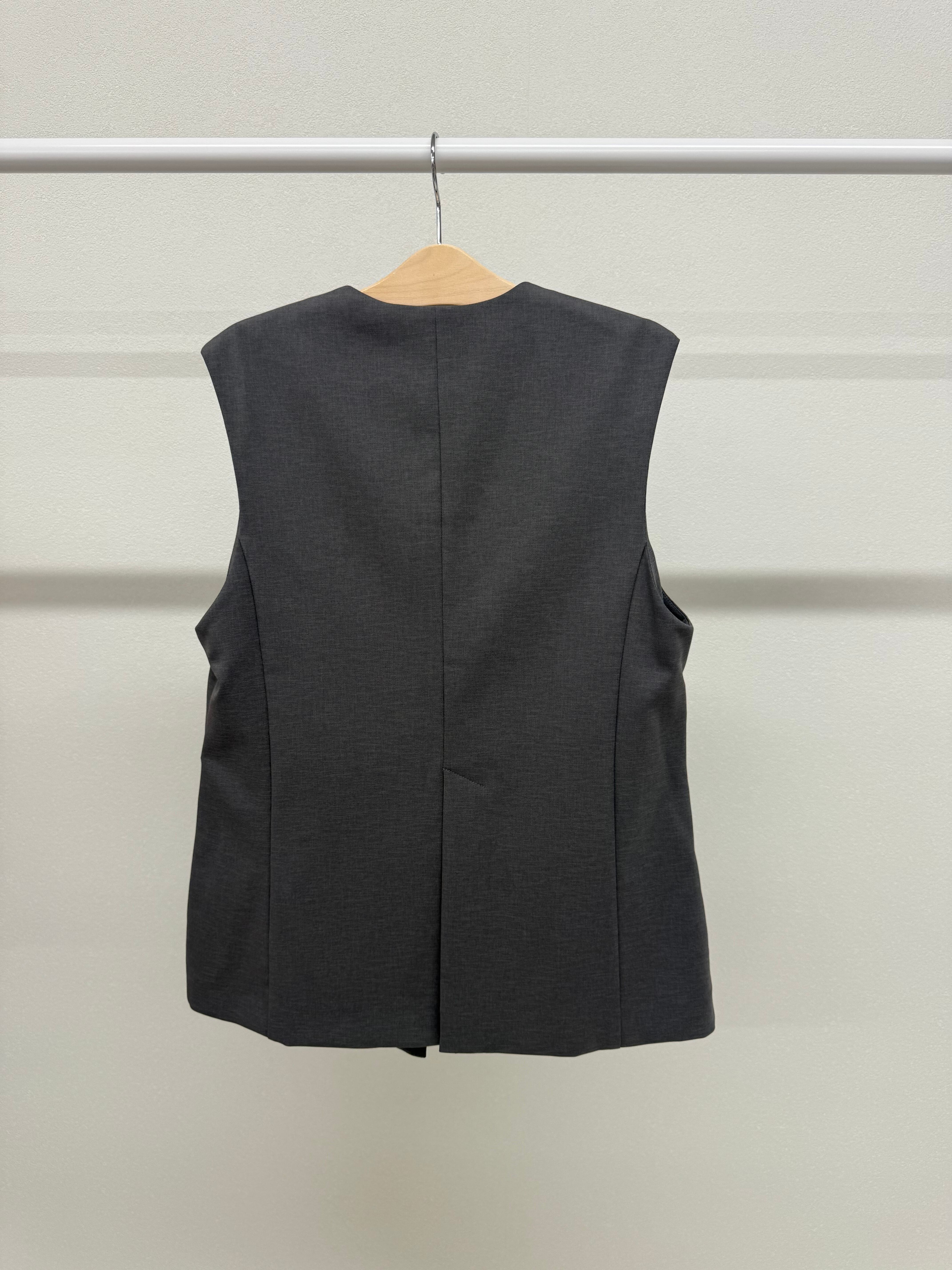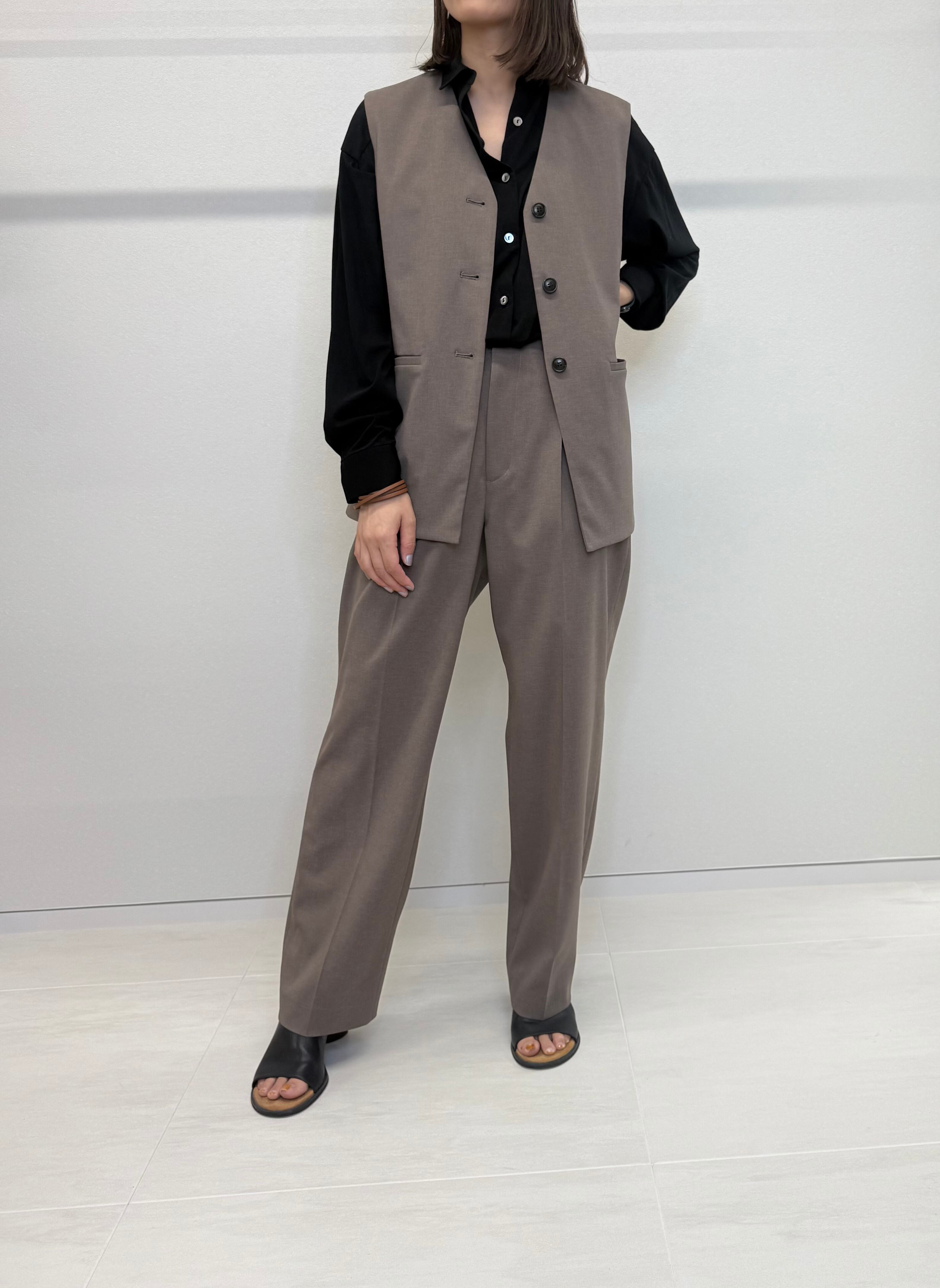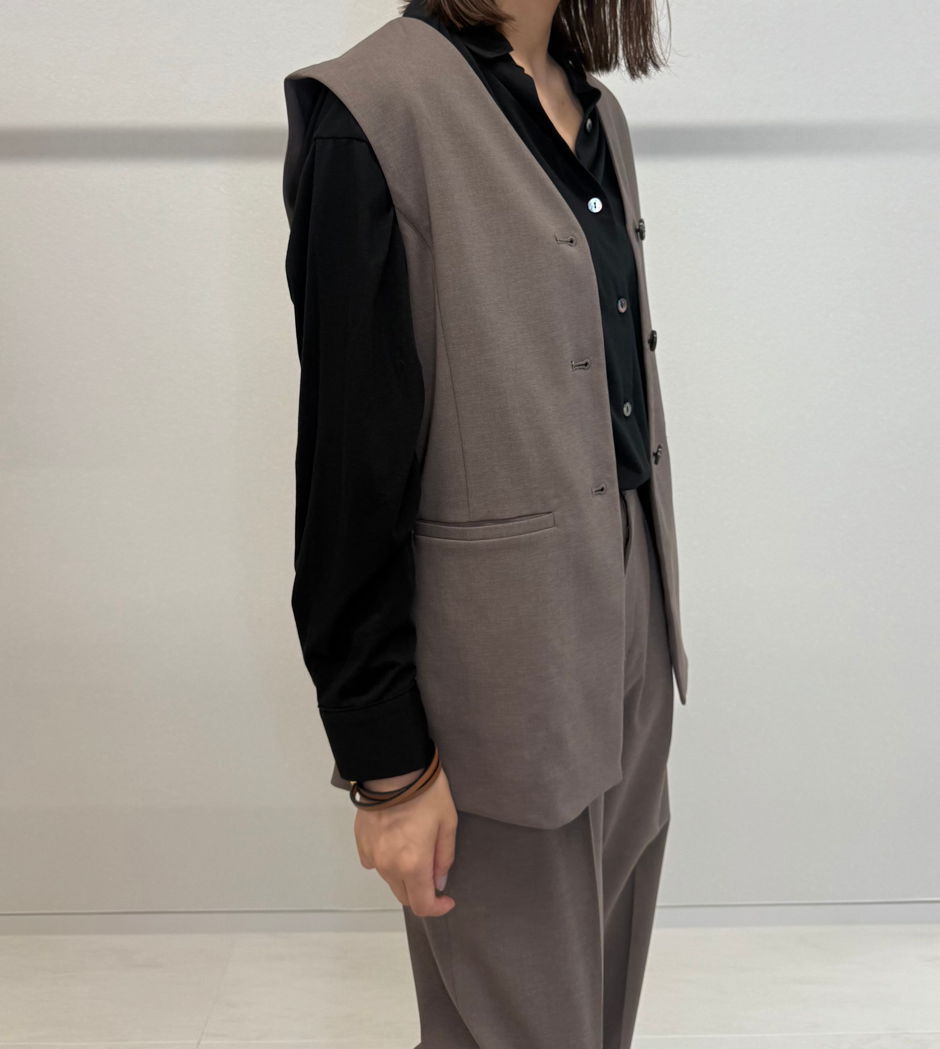 メンズライクなイメージのジレを女性らしく着こなせるように、なだらかなVネックライン・身頃を少レシェイプしたデザインにしています。腰回りを隠してくれるレングス感で縦長なシルエットで着こなしが期待できます。