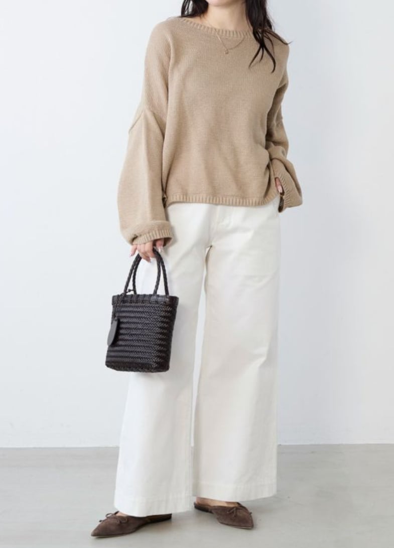 テーラードジャケットなどのきれいめアウターと合わせることで、上下のシルエットにメリハリのある、