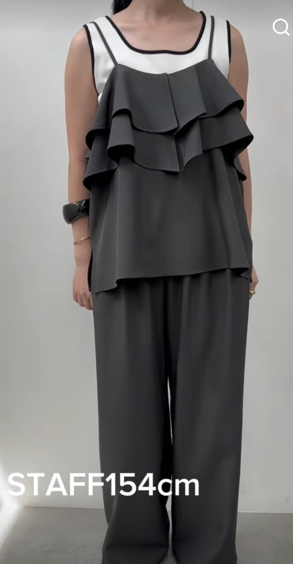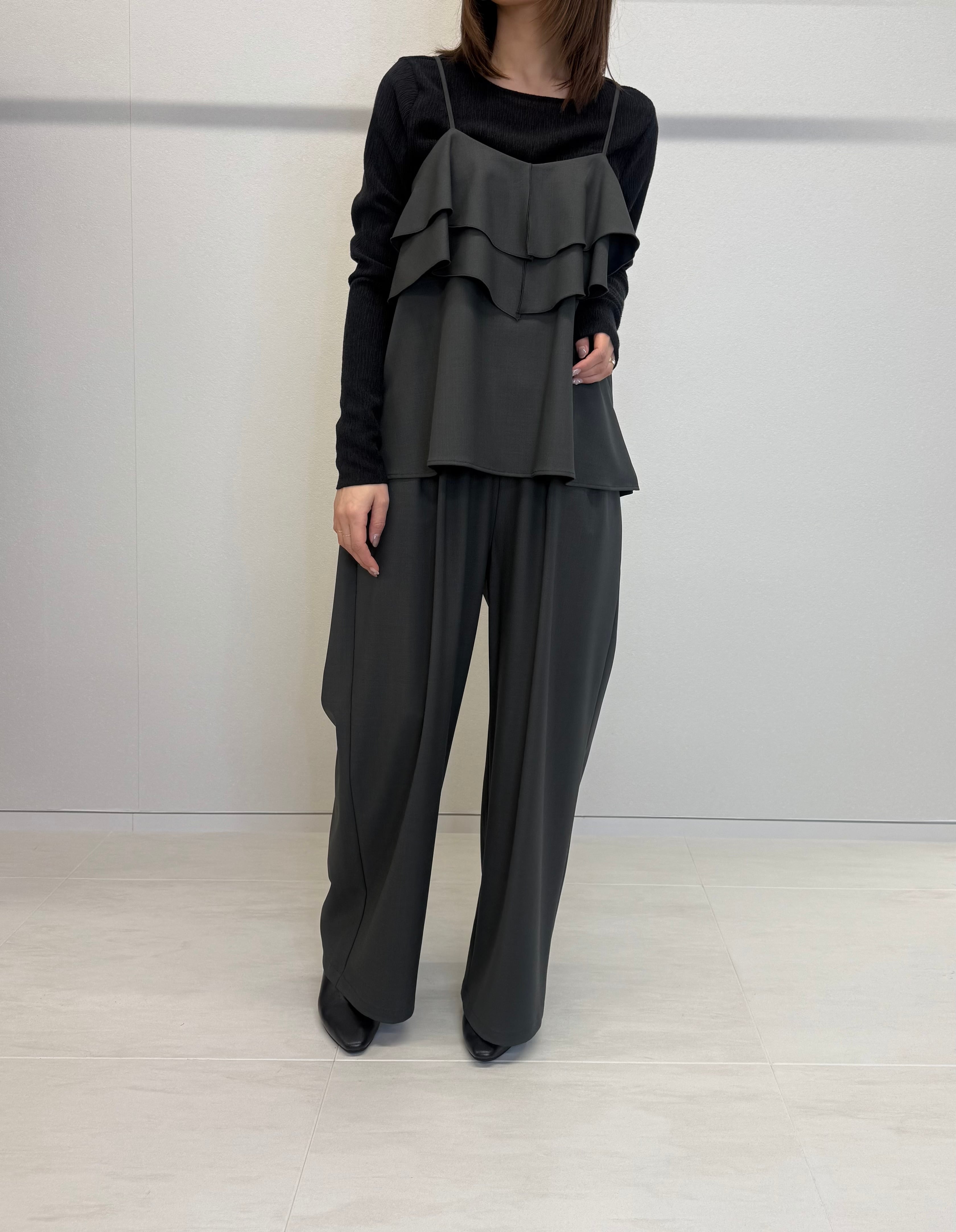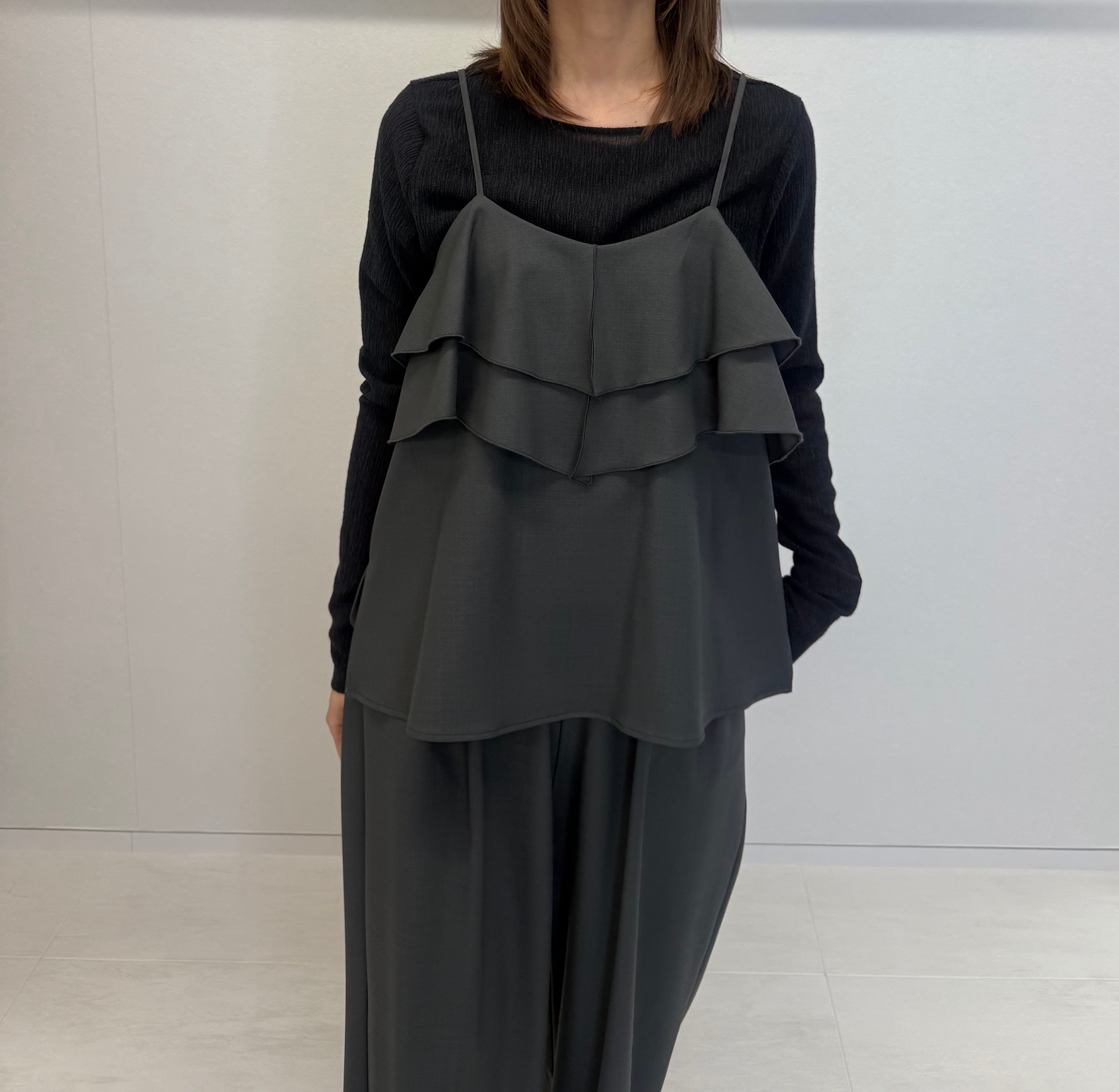 トレンドのフリルキャミソールをドライタッチな素材で大人っぽく仕上げました。