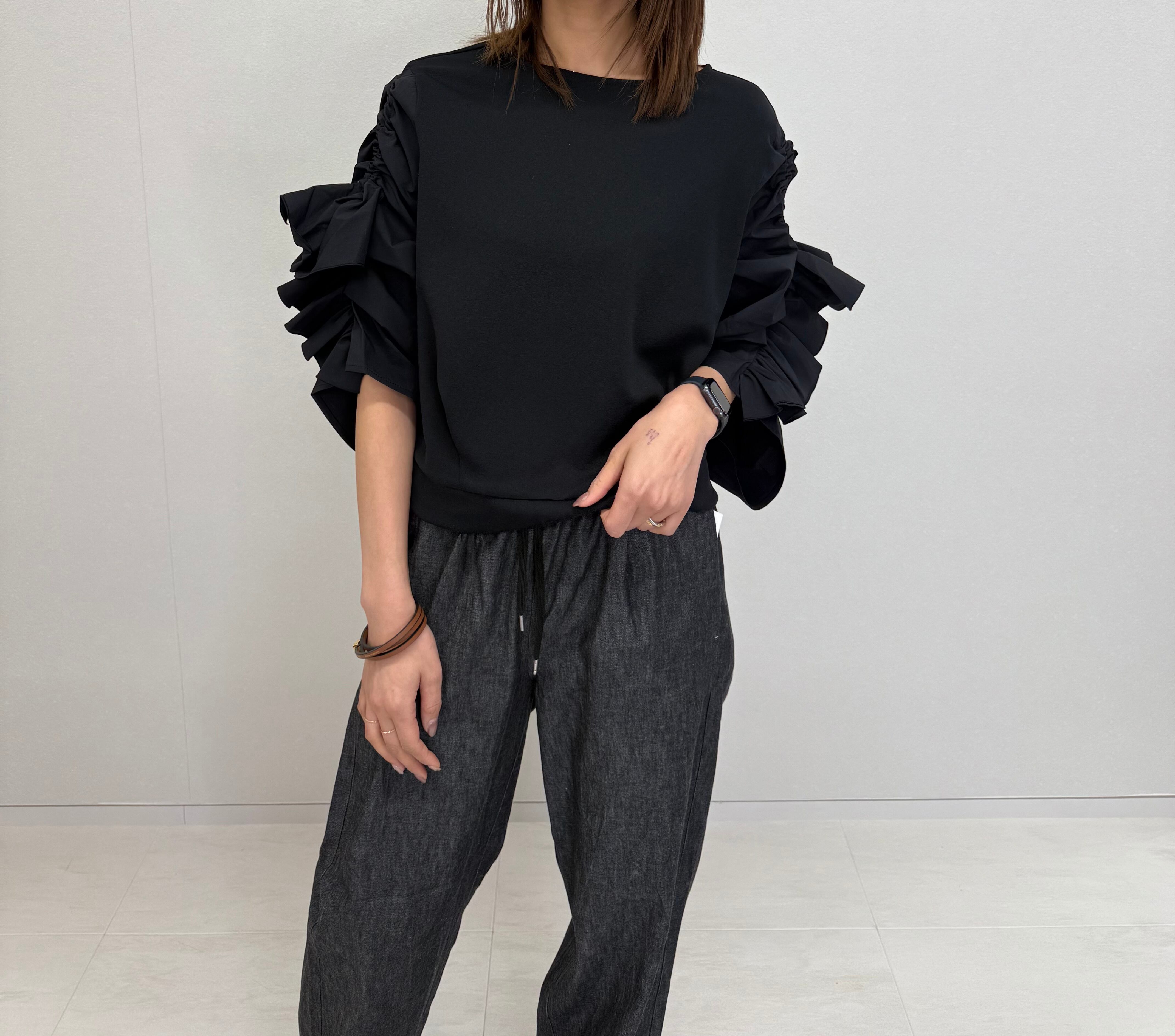 ゴムウエストですが、ギャザー量を控えめにしてヒップとウエストの差を少なくし、