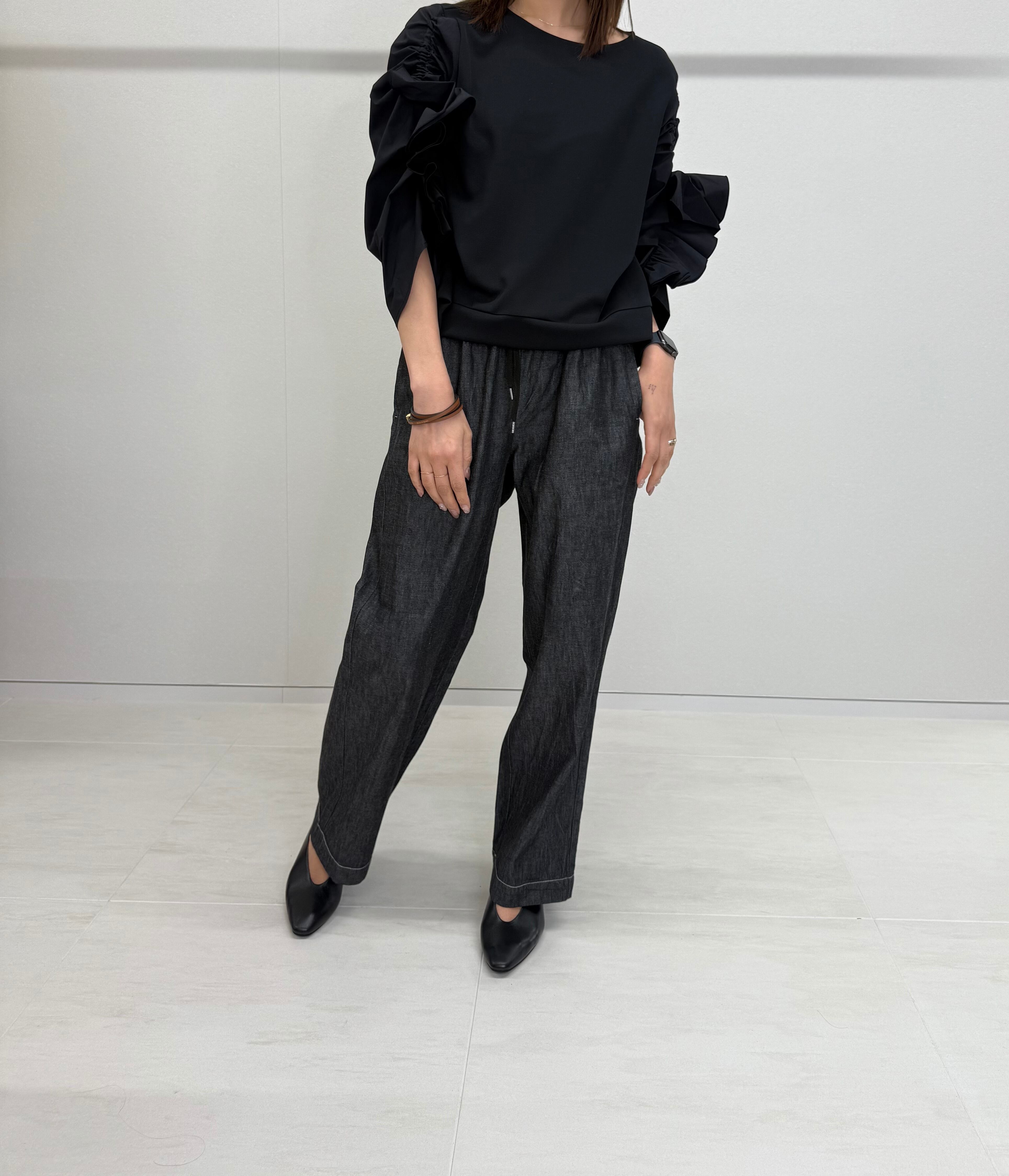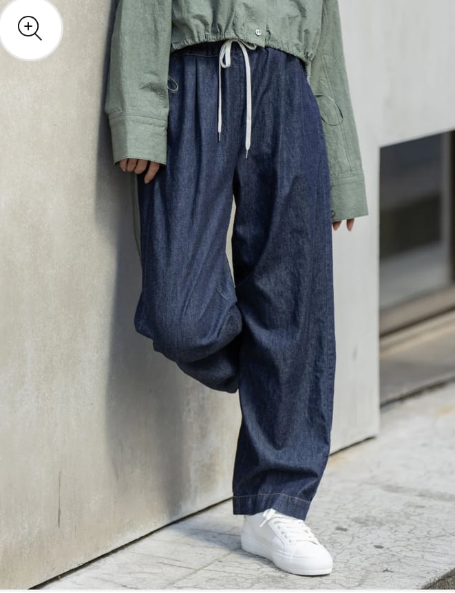 腰廻りの膨らみを抑えることで美脚なストンとしたクセの無いワイドストレートシルエットに仕上がっています。