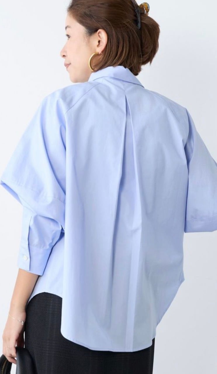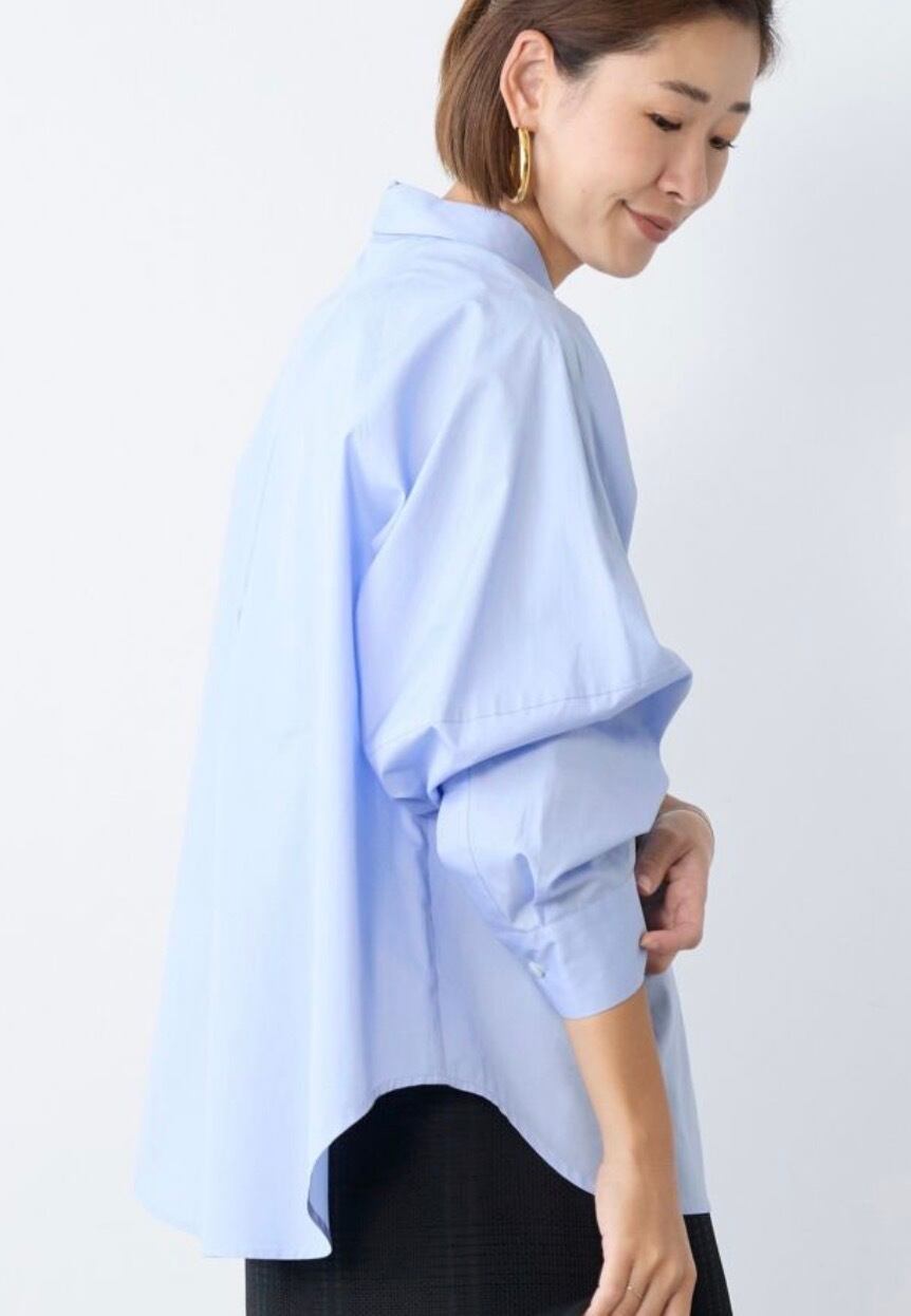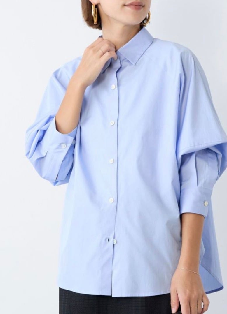 袖のデザインがポイントになっており、袖を下ろしている時は主張し過ぎないボリューム感ですが、袖口をたくしあげればふわっとしたシルエットに。