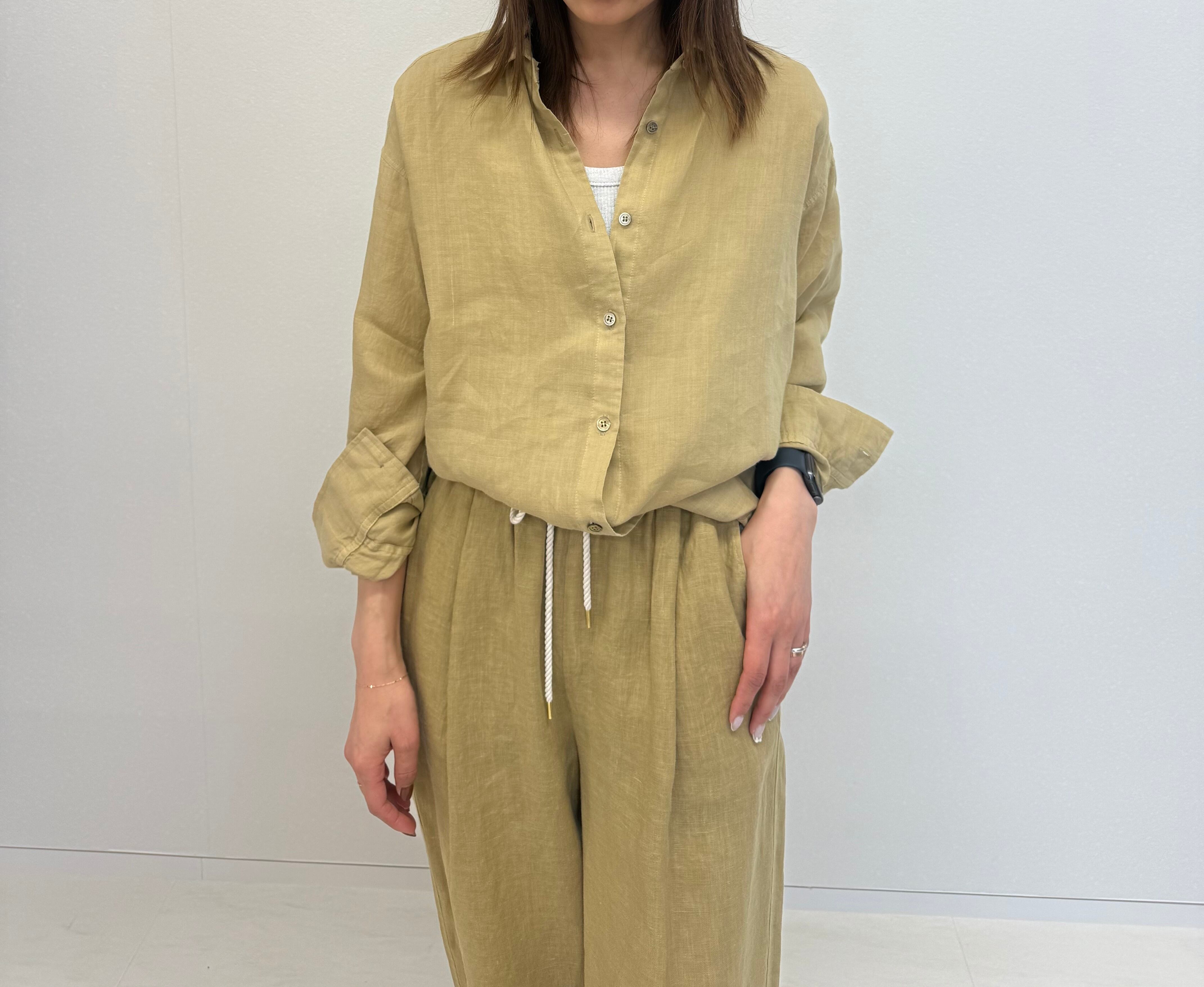 別素材(40リネン)のパンツとセットップでのスタイリングもオススメです。