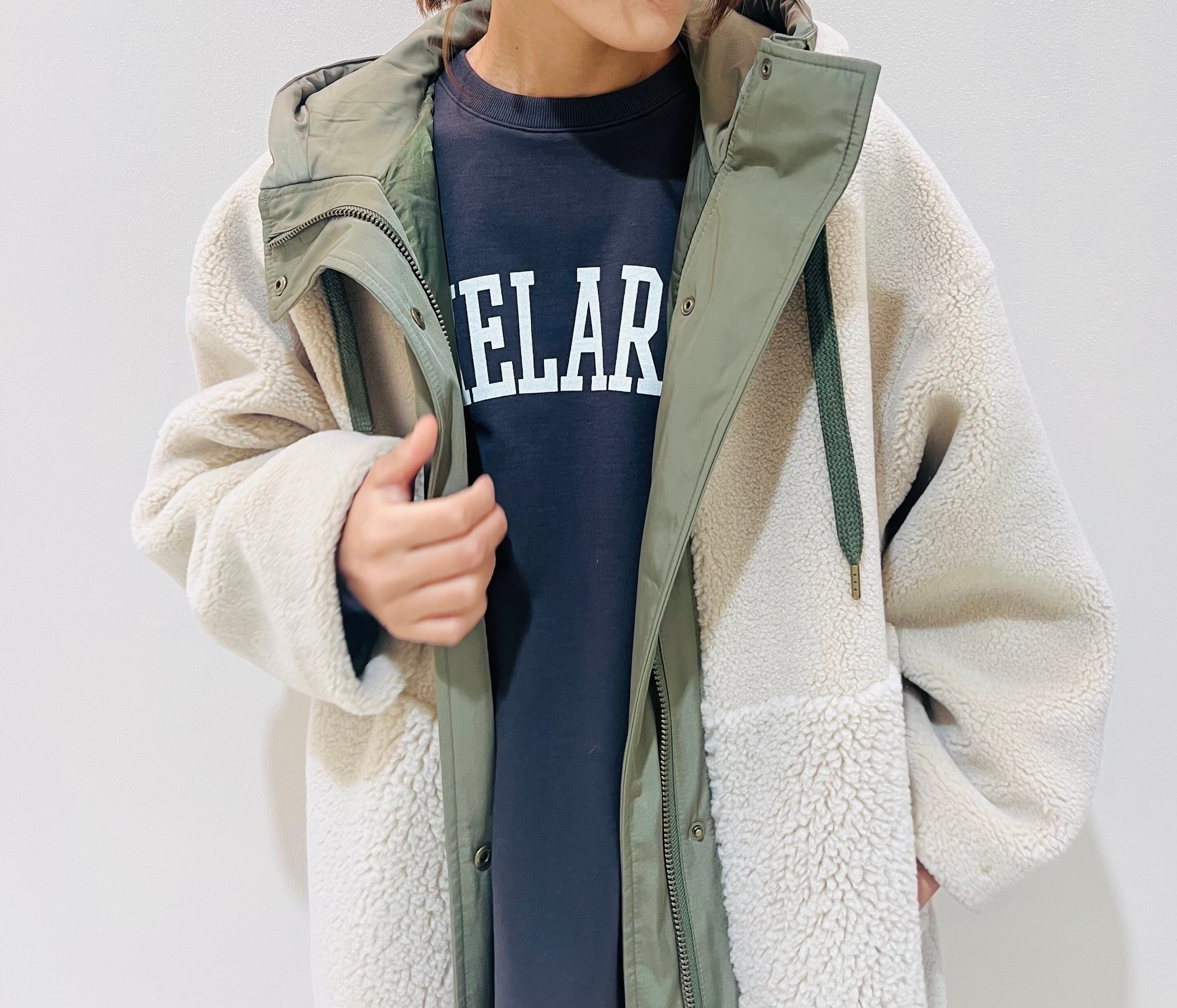 大きめのファスナーを付けて少しミリタリーテイストの匂いがするボアコートは、他にないデザインとなっております。