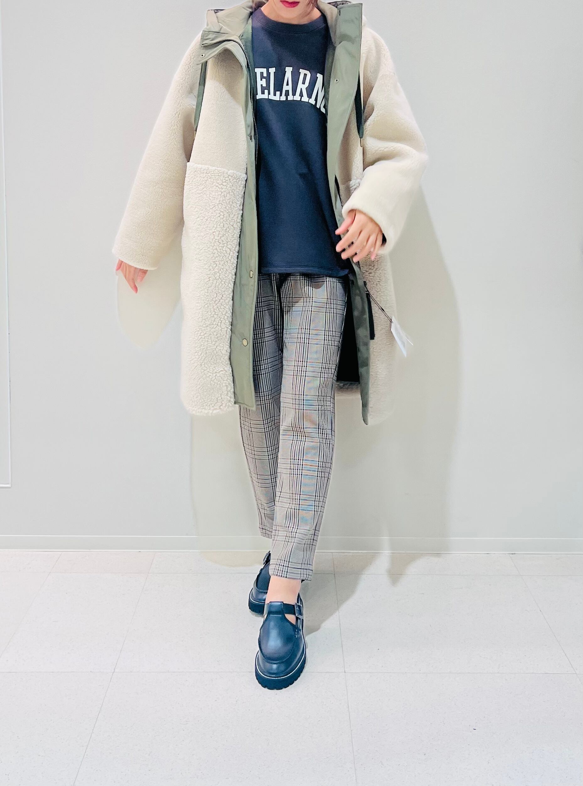 ウール混のフェイクムートン素材を使用し、毛足の異なるボアをウエスト辺りで接いでいます。