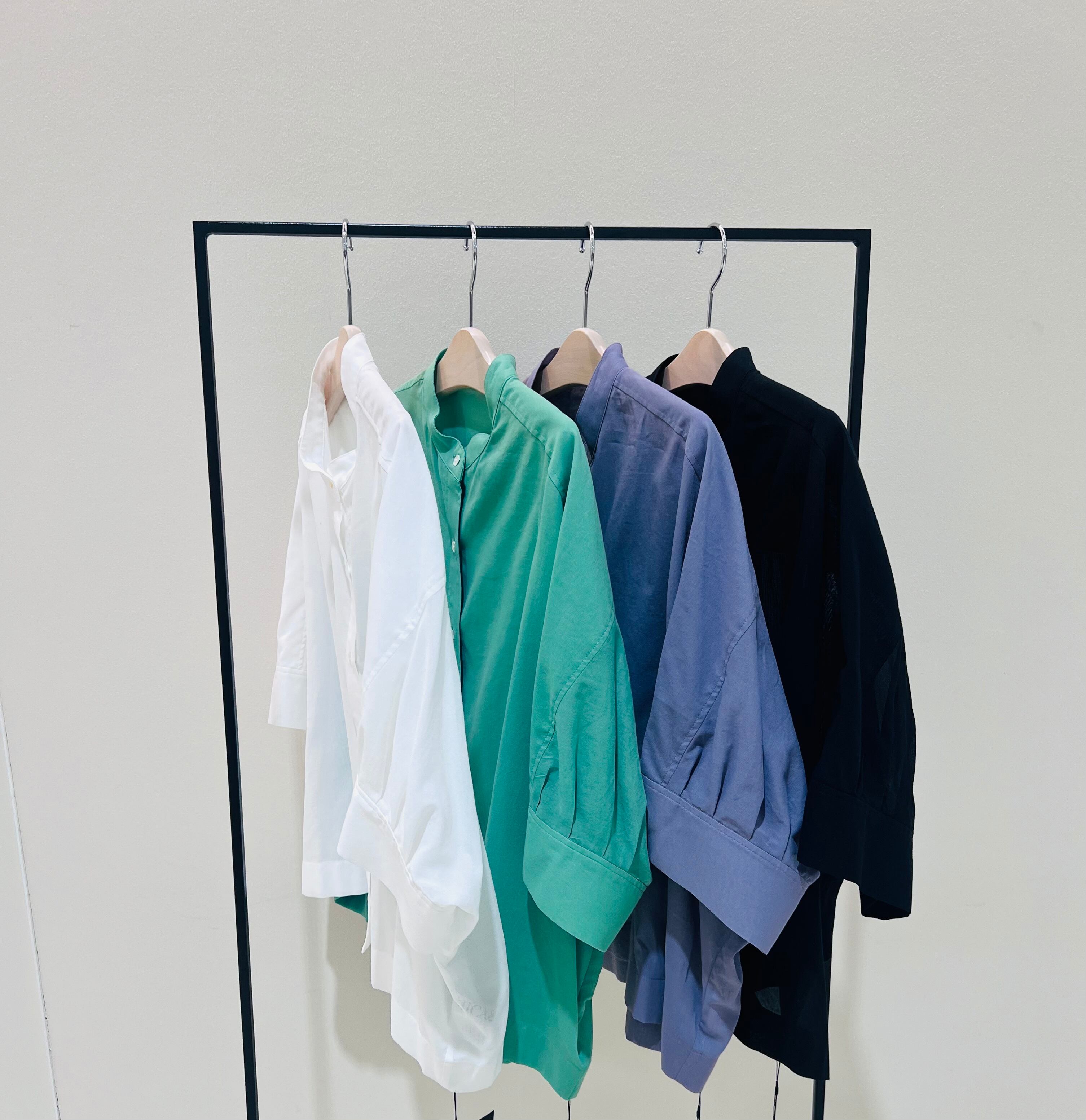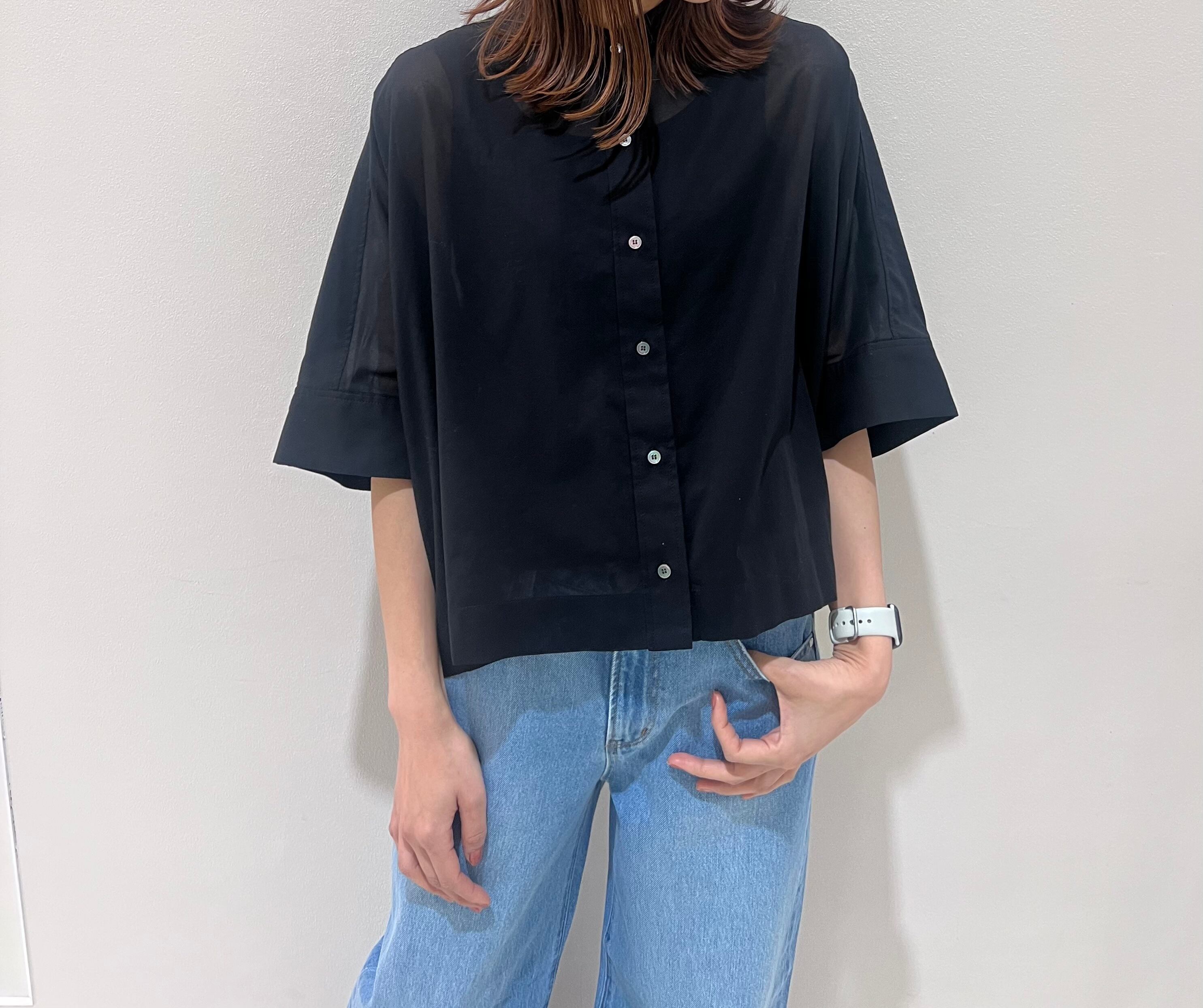 軽やかなオーバーザイズシルエットが魅力のバンドカラーシャツ。スカートにもパンツにも合わせやすく、バランスのとりやすいショート丈で、後ろにかけてはやや長めなシルエットです。