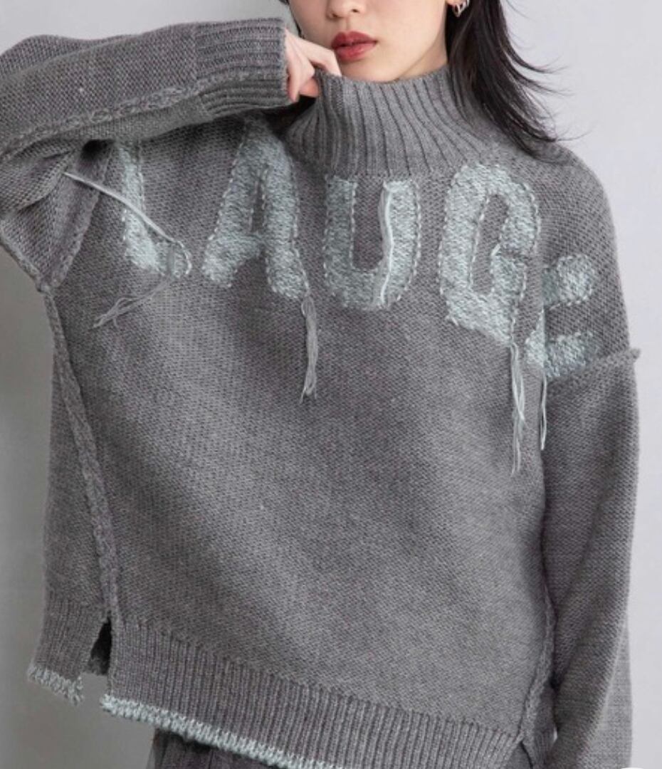 ロゴは、身頃とは異素材糸のモヘアタッチのタム糸を使用し、配色で手書き風のフォントをインターシャジャガードで表現しました。