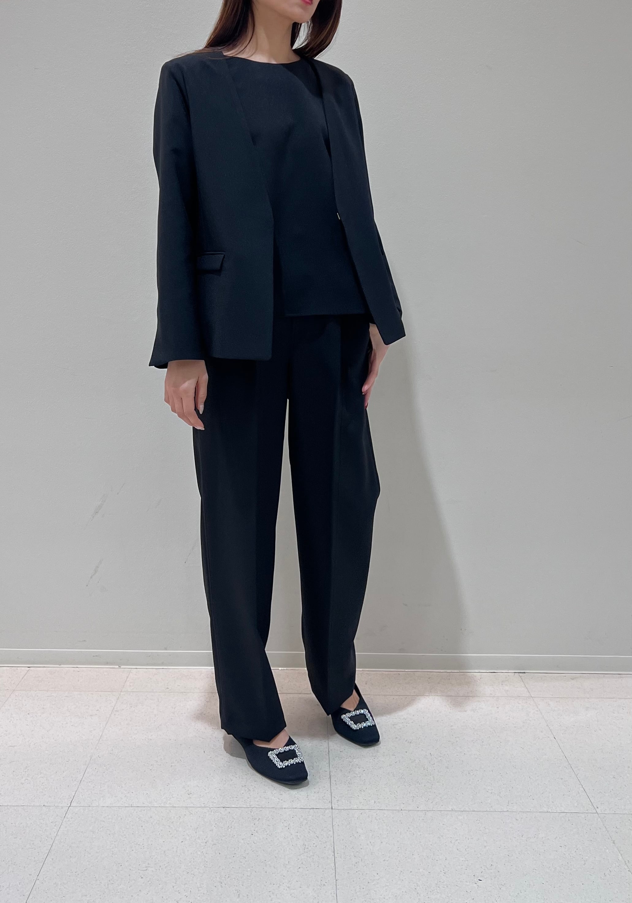 ノーカラーでよりすっきりとした印象になりゴールドのホックはフェミニンできちんと感もあり。