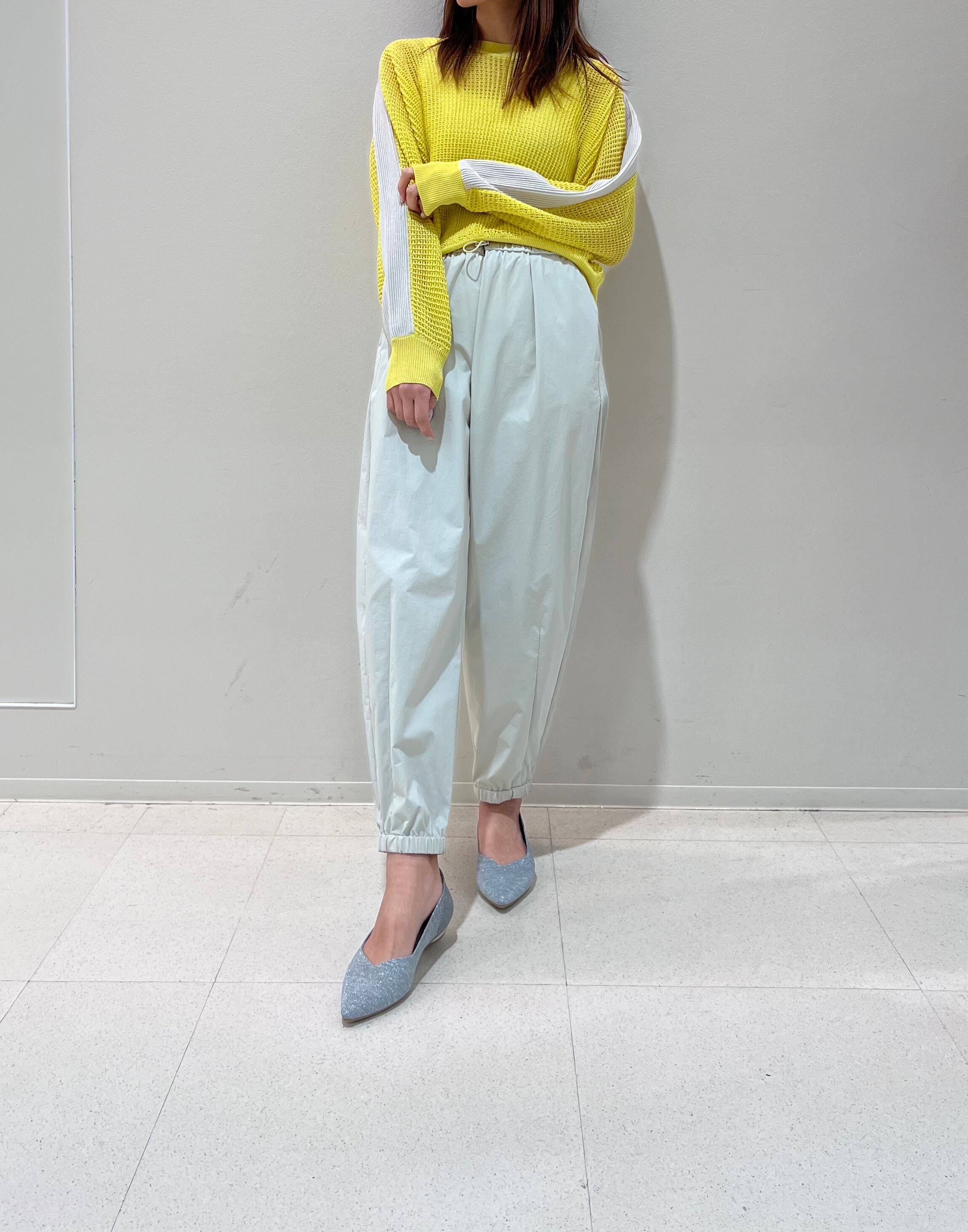 さらにウエストには配色カラーの丸ゴムを入れ、デザインのワンポイントにしています。