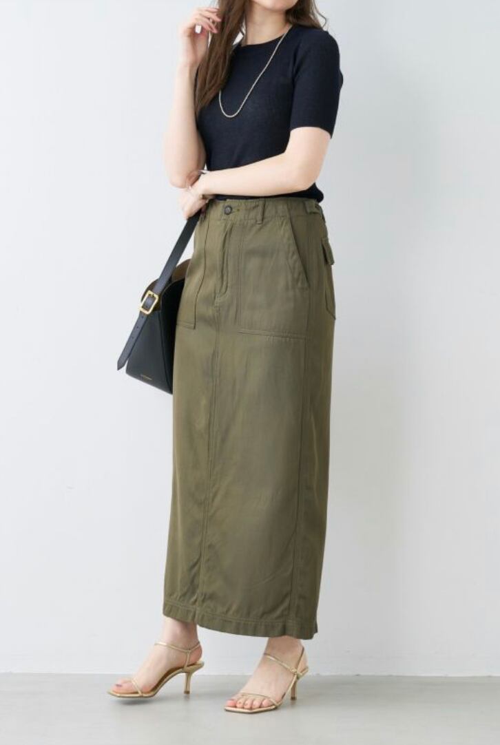 経糸にレーヨンのフィラメント糸を使用し、程よい光沢感とレーヨン特有の柔らかさが特徴な生地を使用したタイトスカート。