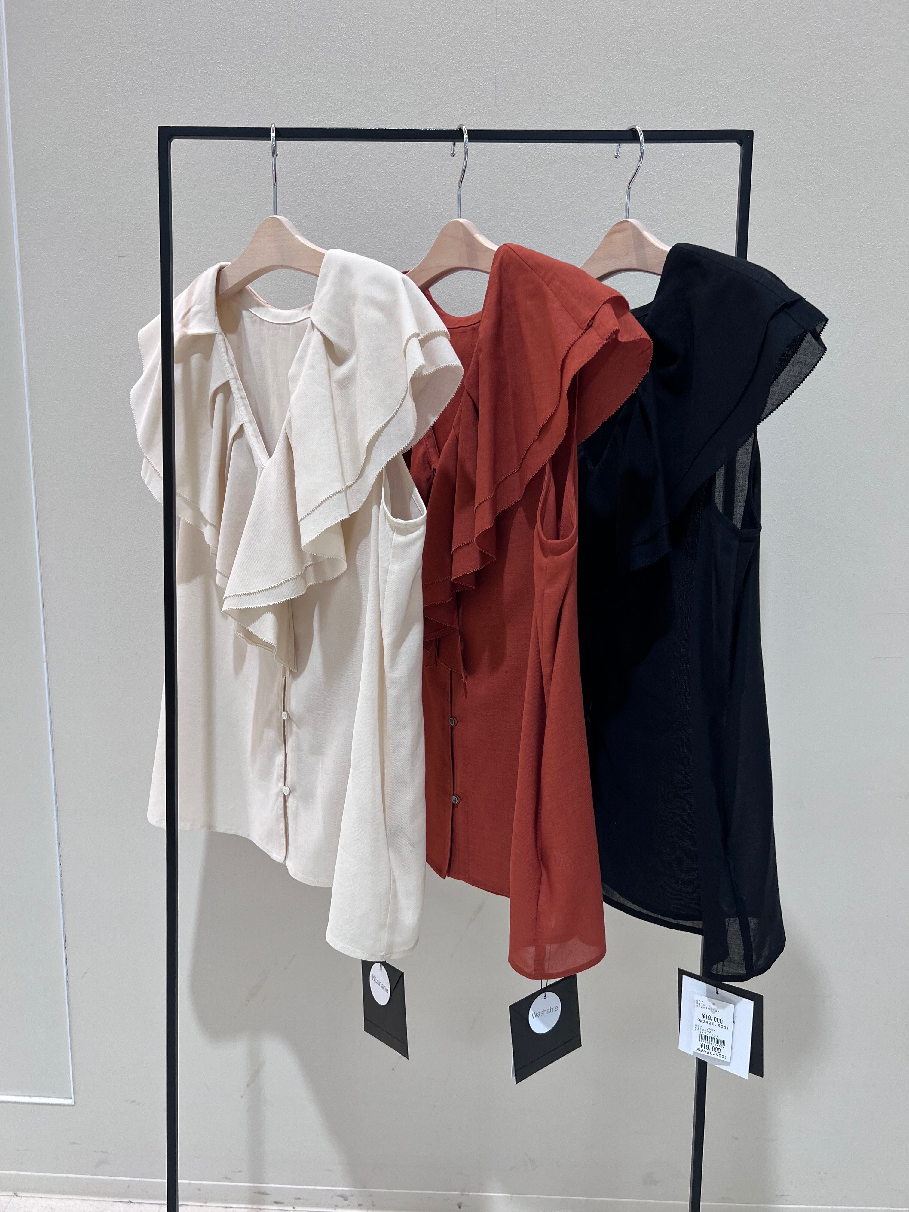 Vネックラインをベースに、ラッフルカラーを付けることで甘さの中にシャープなラインを作り大人なイメージをまとめた1枚です。サラッとした清涼感と肌あたりの良いソフトな風合いなので、暑い時期にも着用しやすい着心地です。