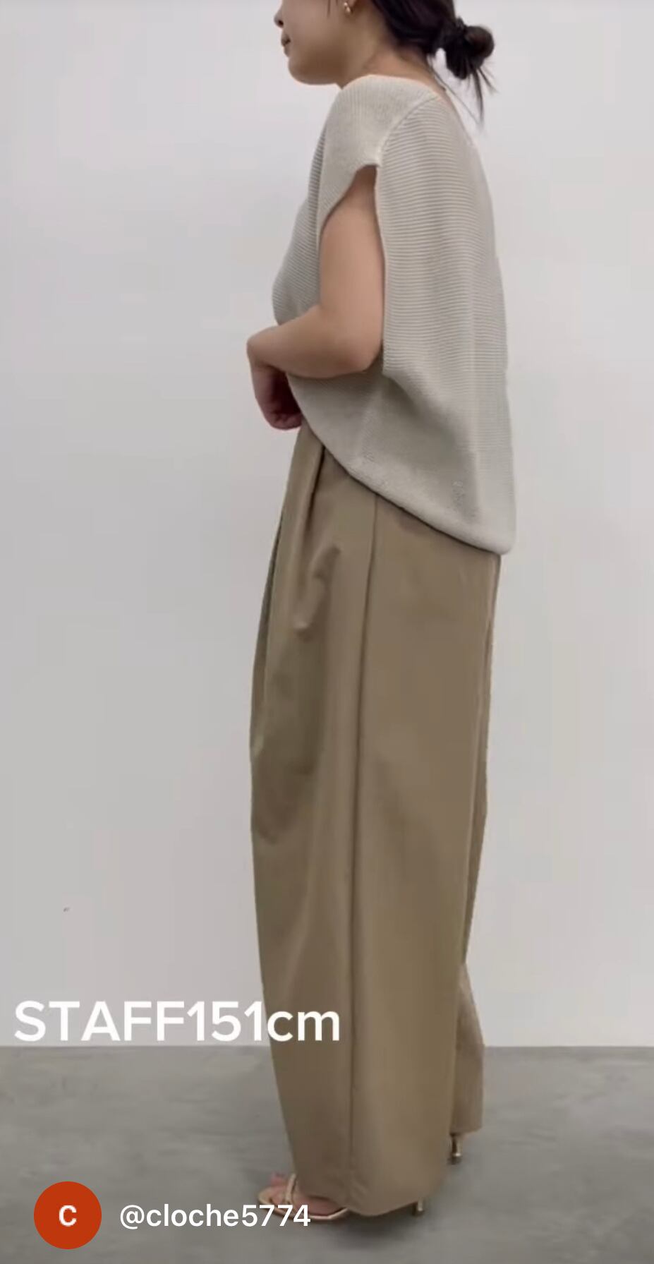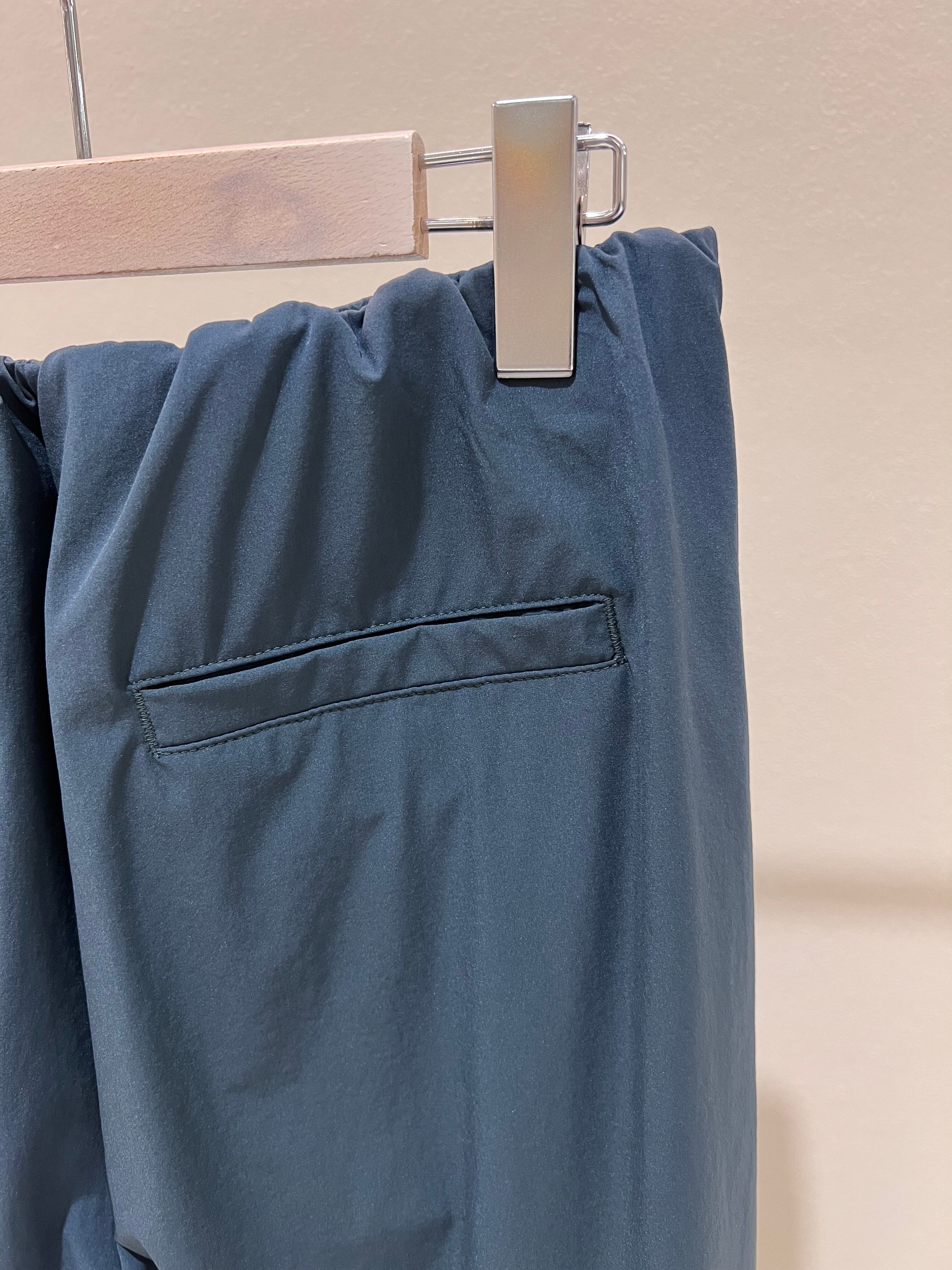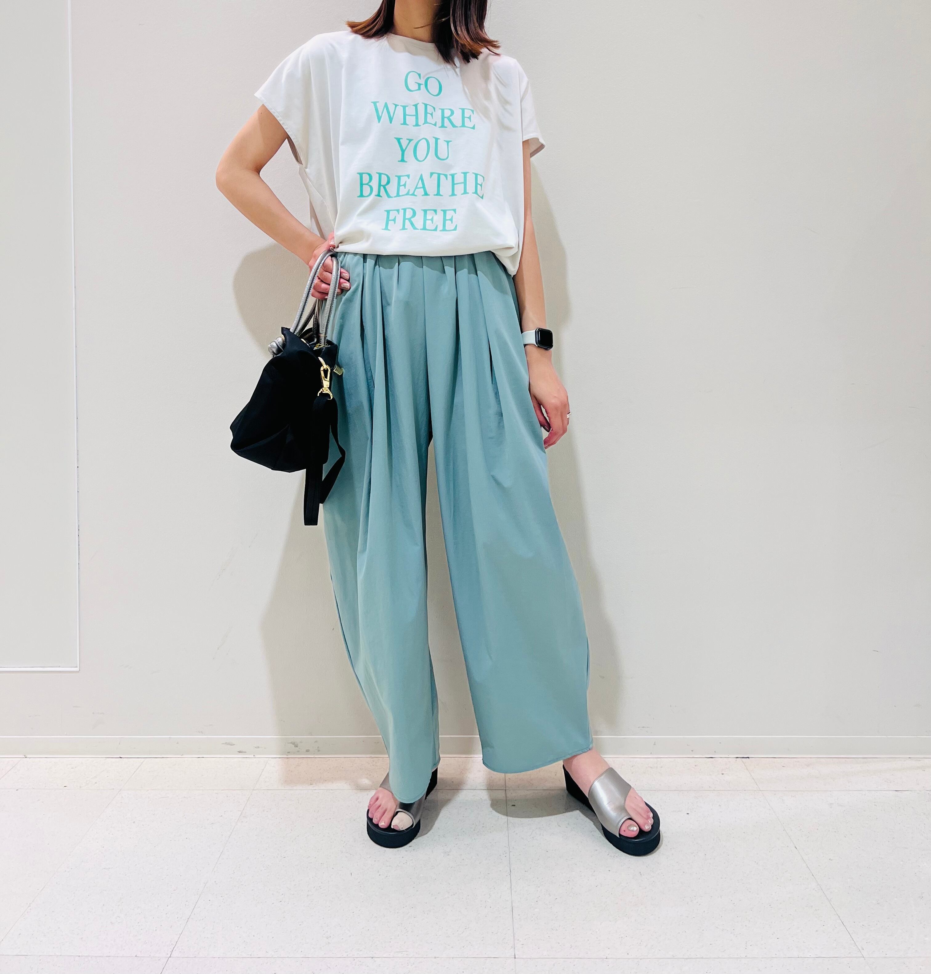 ウエストまわりの複雑なタックデザインが可愛いコクーンシルエットのパンツをイージーケア対応/接触冷感のある生地に落とし込みました。