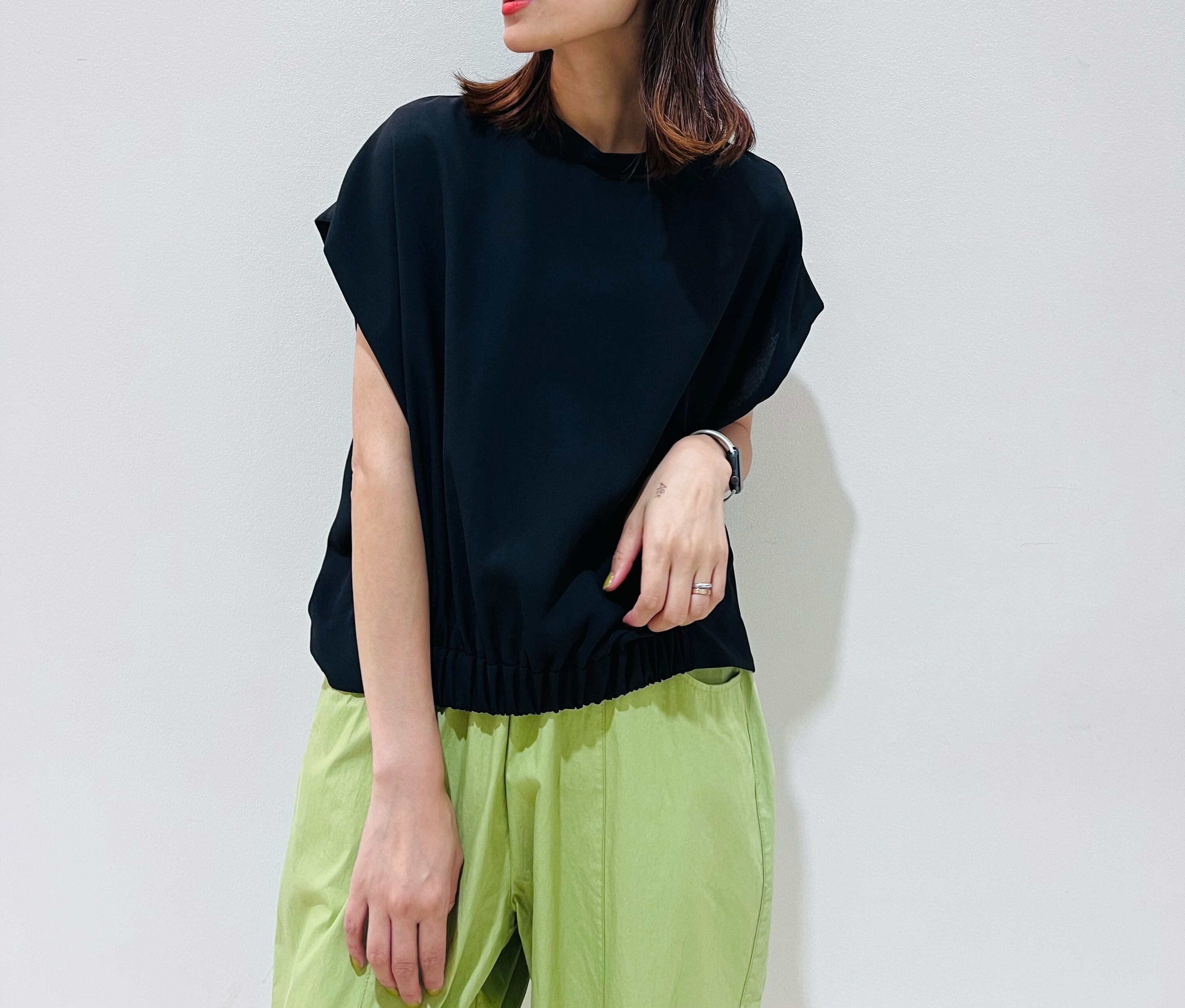 裾にギャザーをよせて立体感を出し、立体的なフォルムとヒップにかかる丈感がリラックスしてきていただけます。
