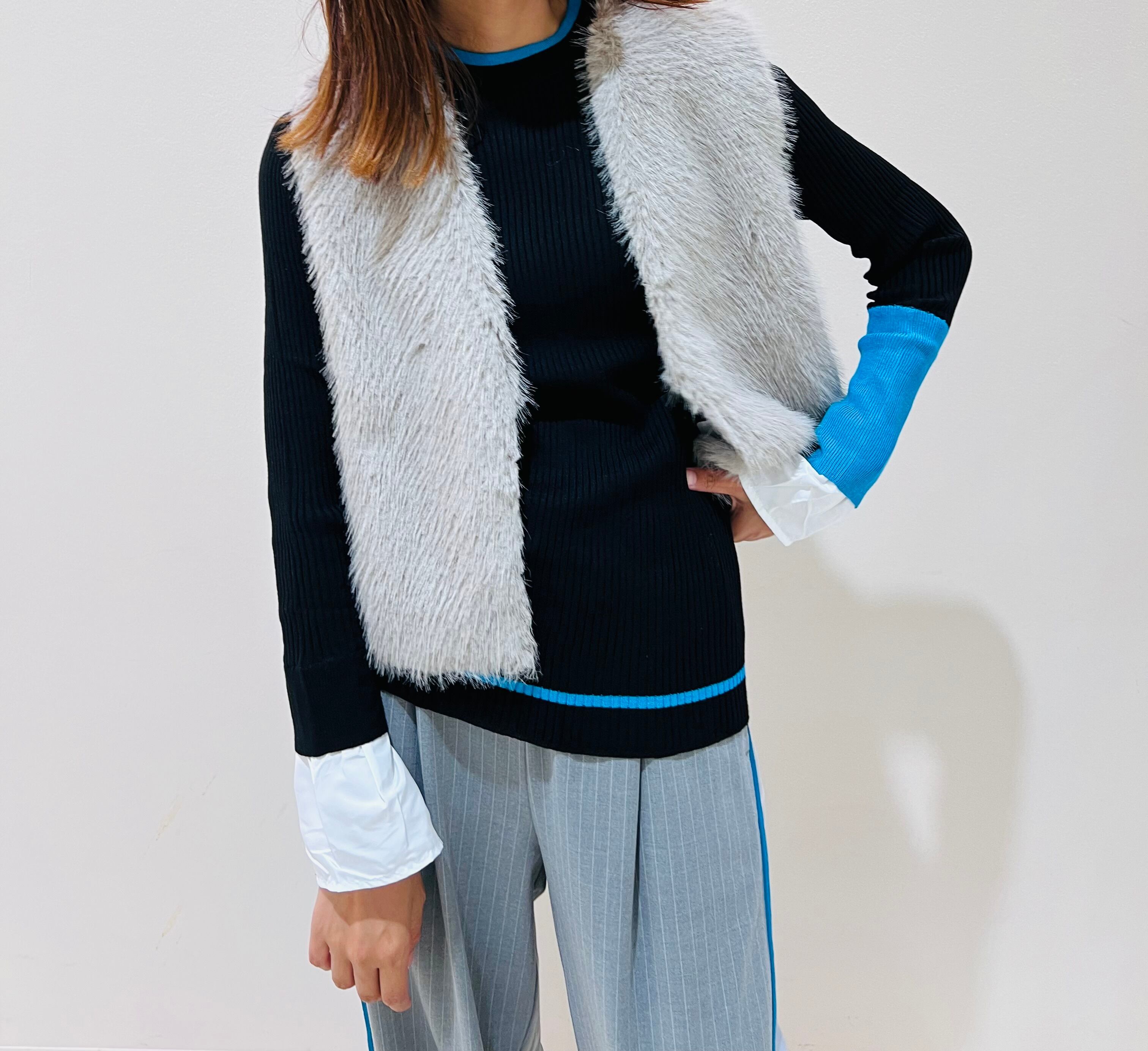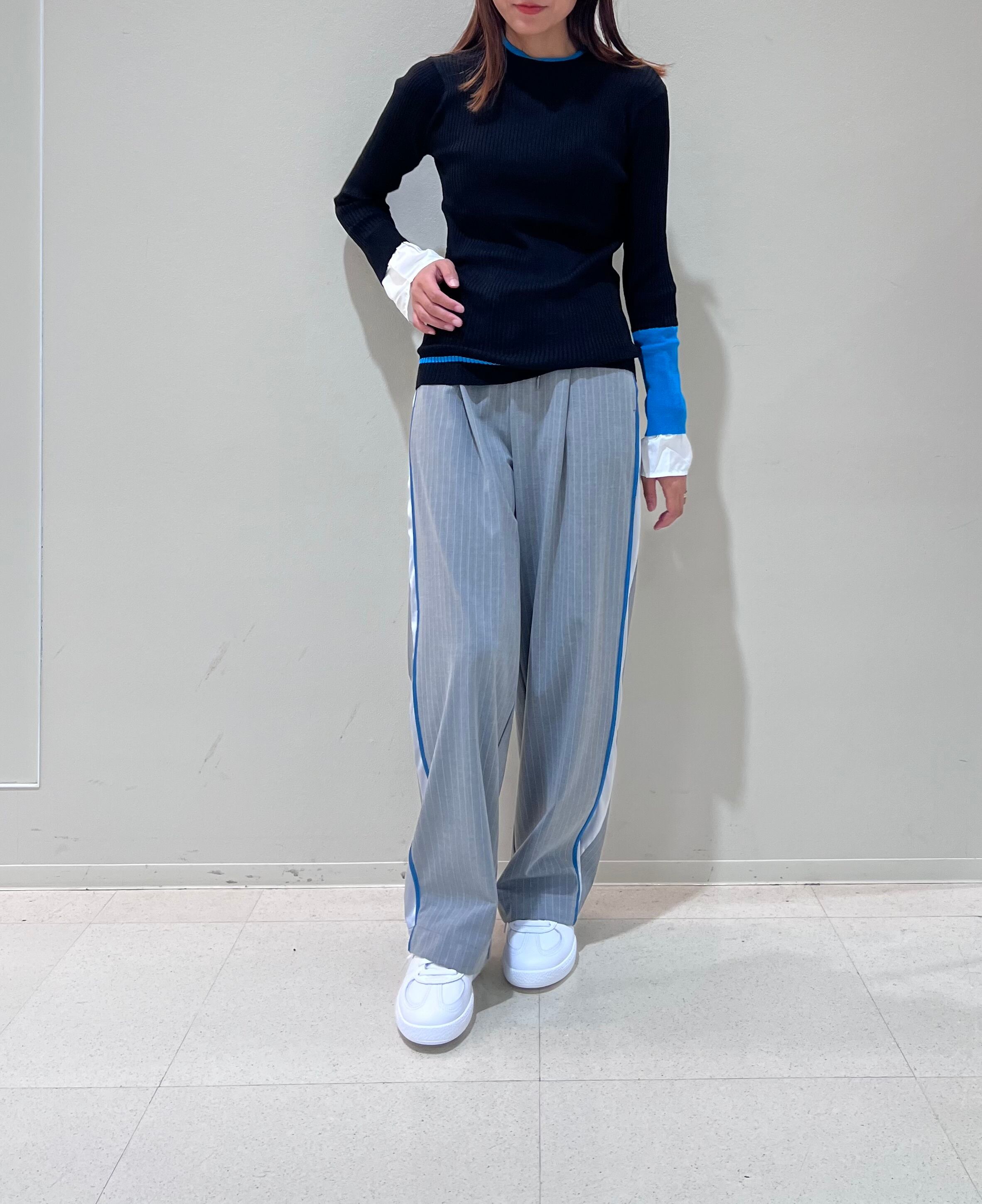 左袖配色と同じカラーで衿ぐりと裾にも細めのライン配色を入れてデザインにアクセントを出しています。