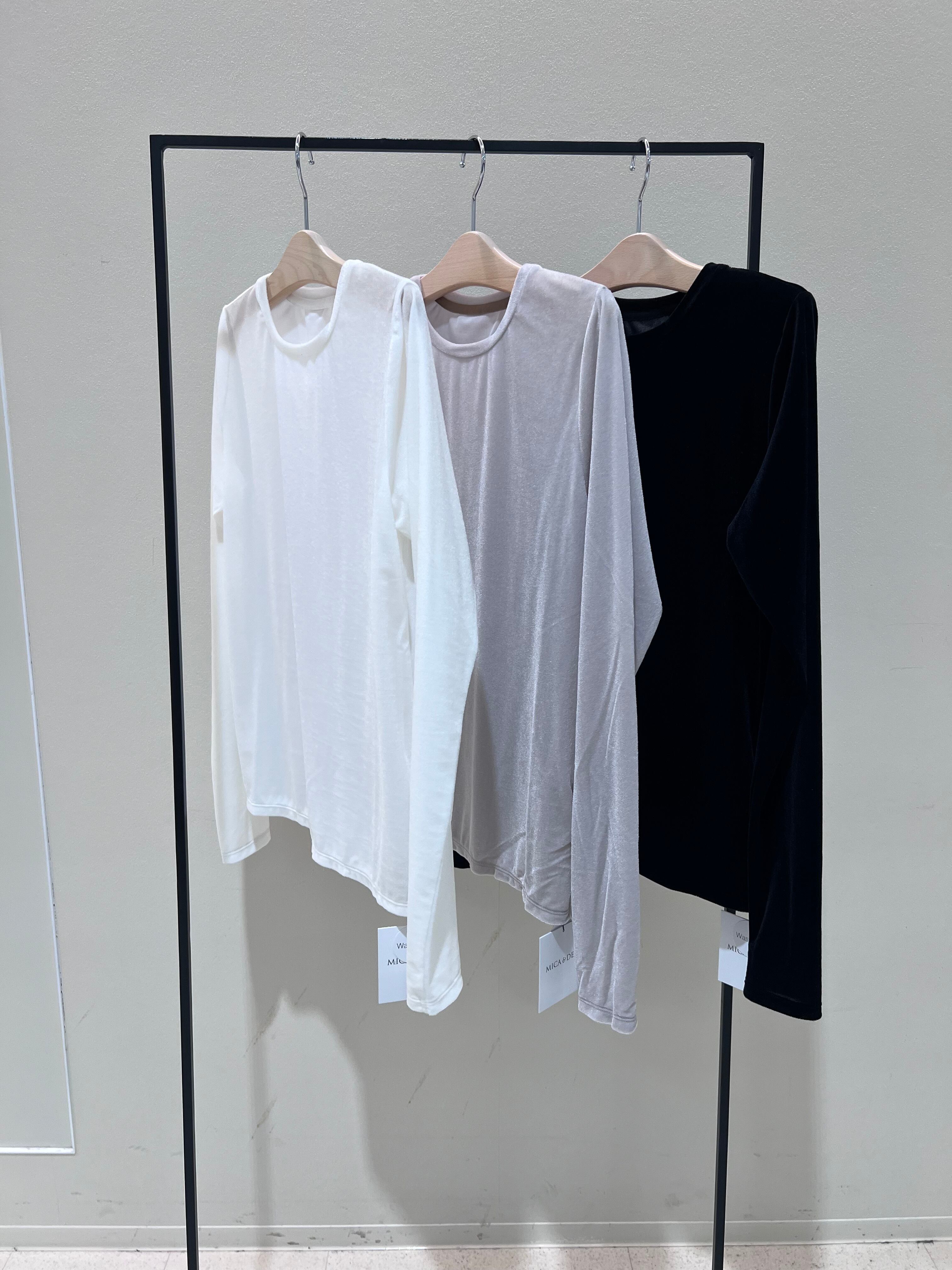 素材の魅力を活かしたロンTEE。シアーベロアの質感はスタイリングに秋感をたっぷりプラスします。