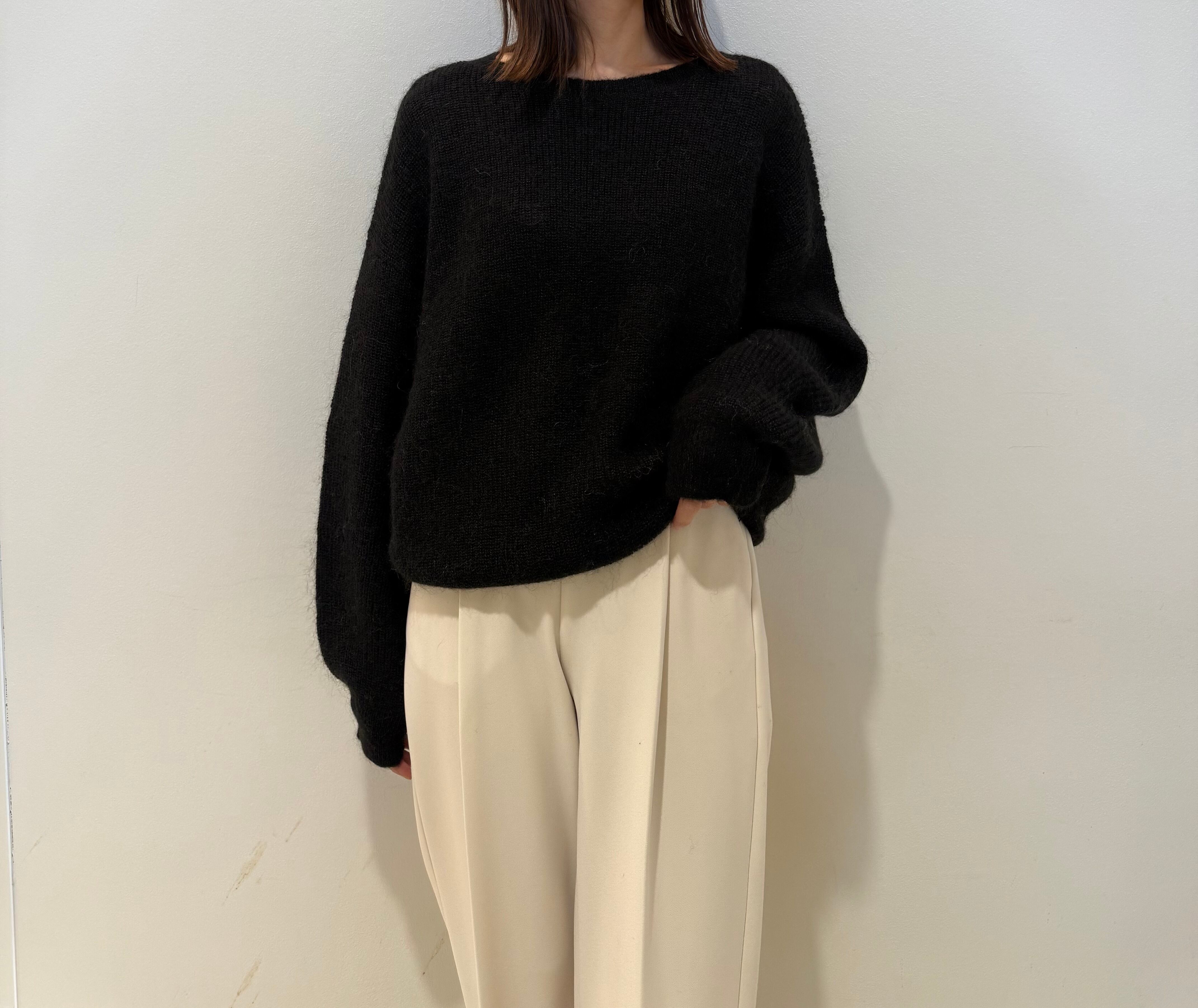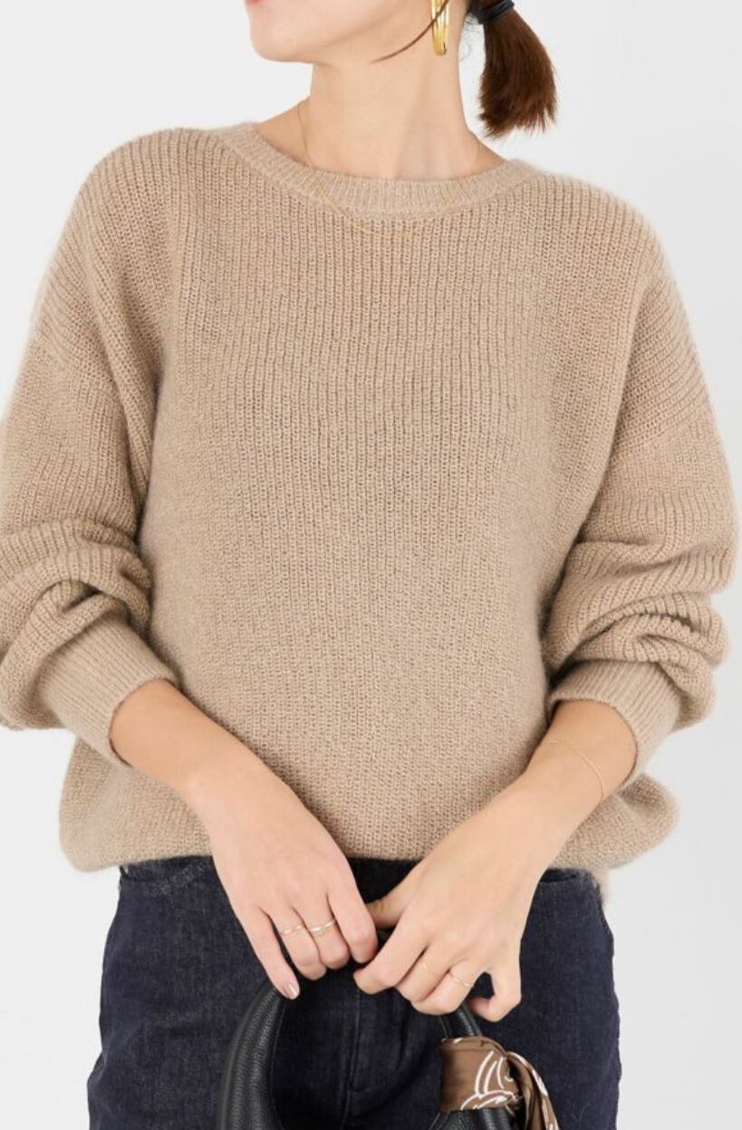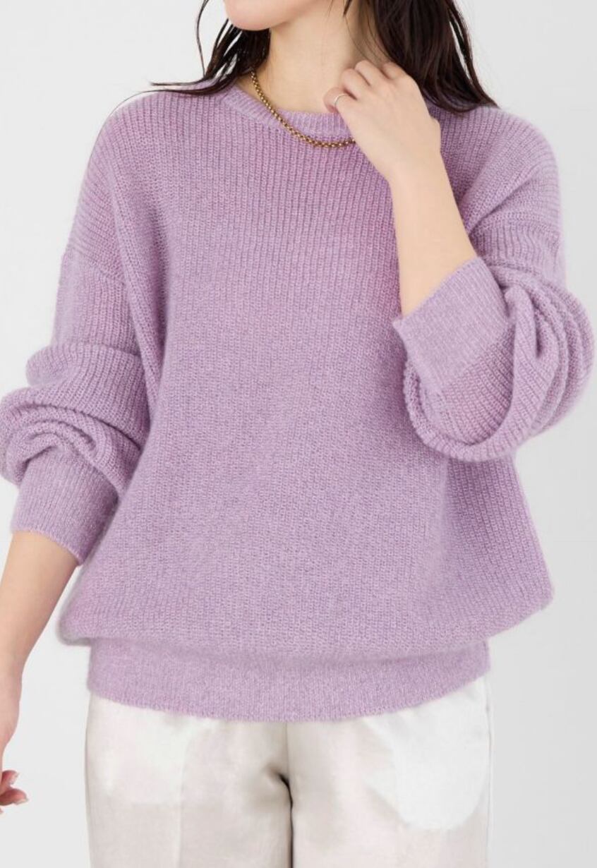 カジュアルになりがちな畦ニットですが、起毛感のあるモヘア混の糸と、ペーパーヤーンで編み上げることで柔らかな雰囲気を演出しました。