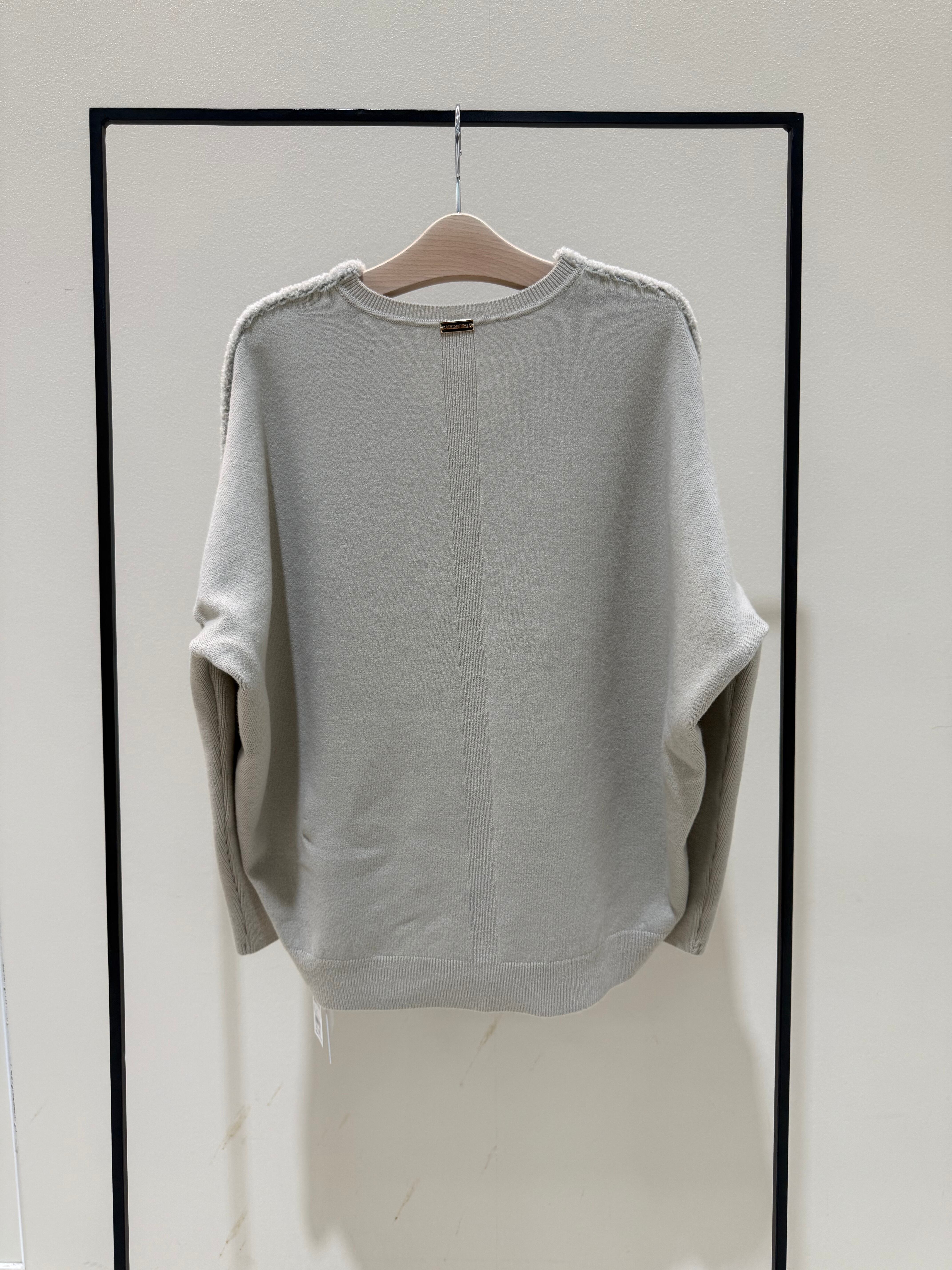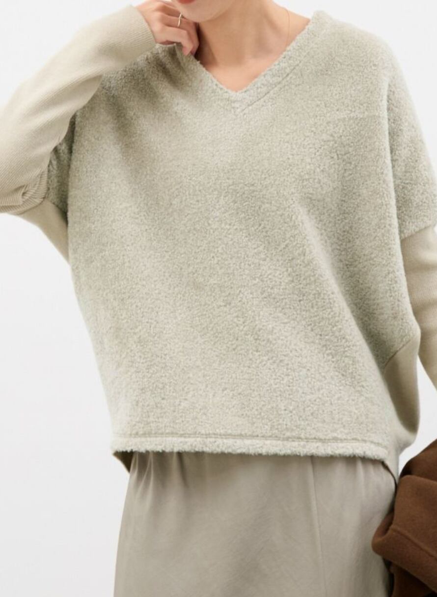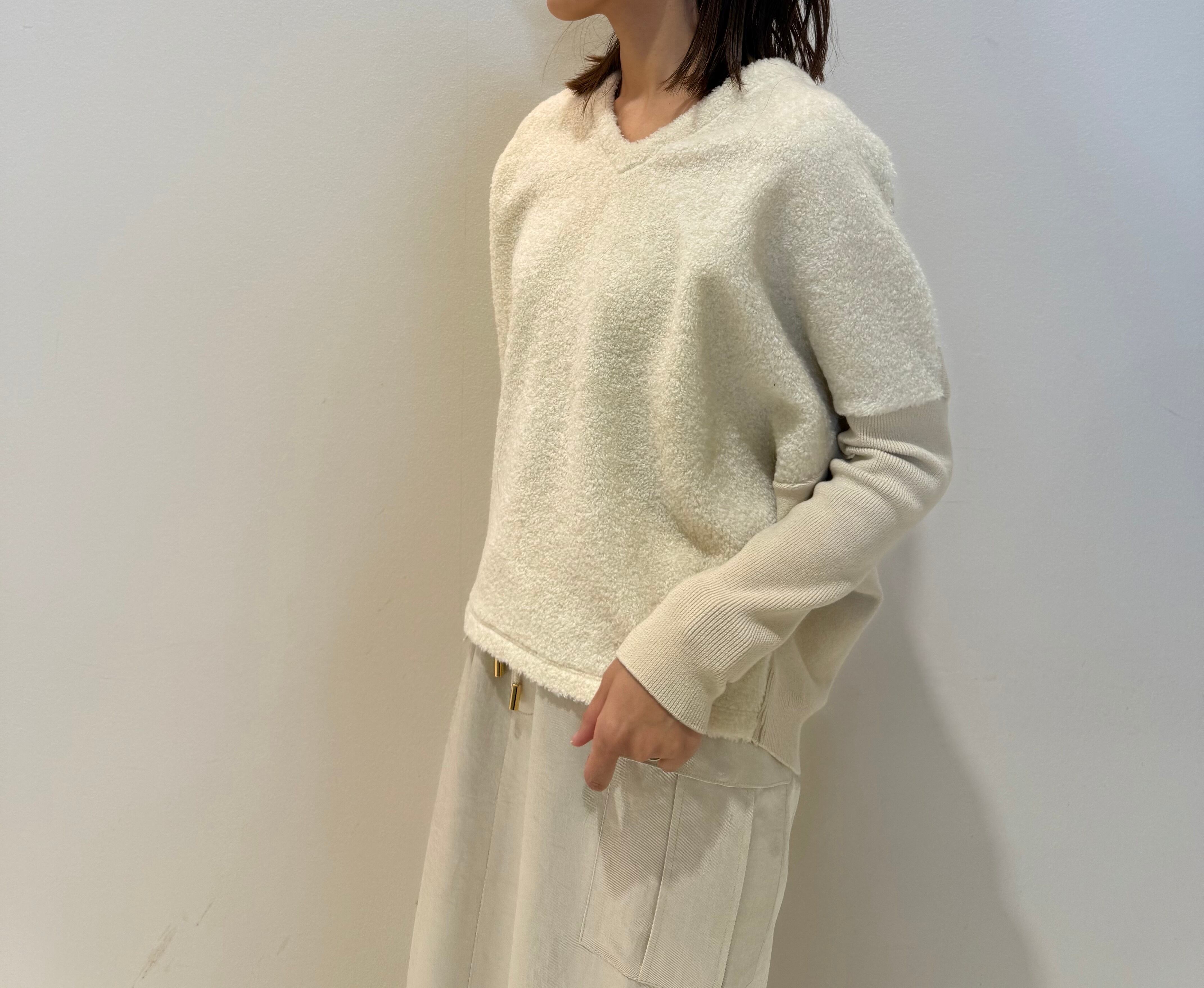 前身頃のふわふわの表情感が可愛らしい異素材切り替えのニットプルオーバー。